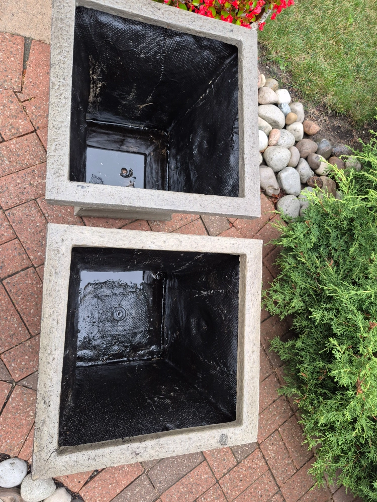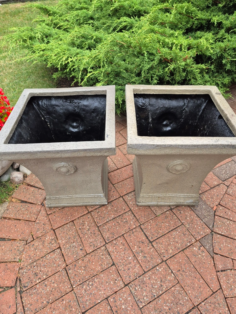 Selling a set of square garden planters. Unique design. Strong construction. They have an elegant a d classic design and are perfect for adding some greenery to your outdoor space. They are in great condition and ready for your favourite plants! Price is for the set. Great deal! Measures 21 hogh by 18 inches wide.