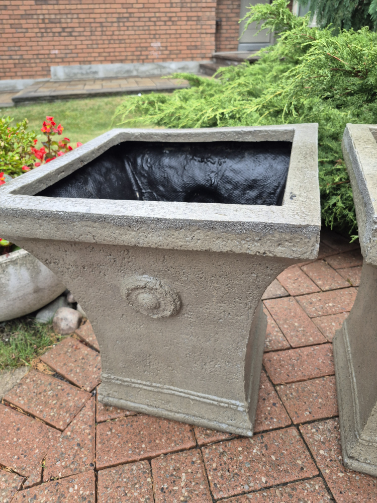 Selling a set of square garden planters. Unique design. Strong construction. They have an elegant a d classic design and are perfect for adding some greenery to your outdoor space. They are in great condition and ready for your favourite plants! Price is for the set. Great deal! Measures 21 hogh by 18 inches wide.