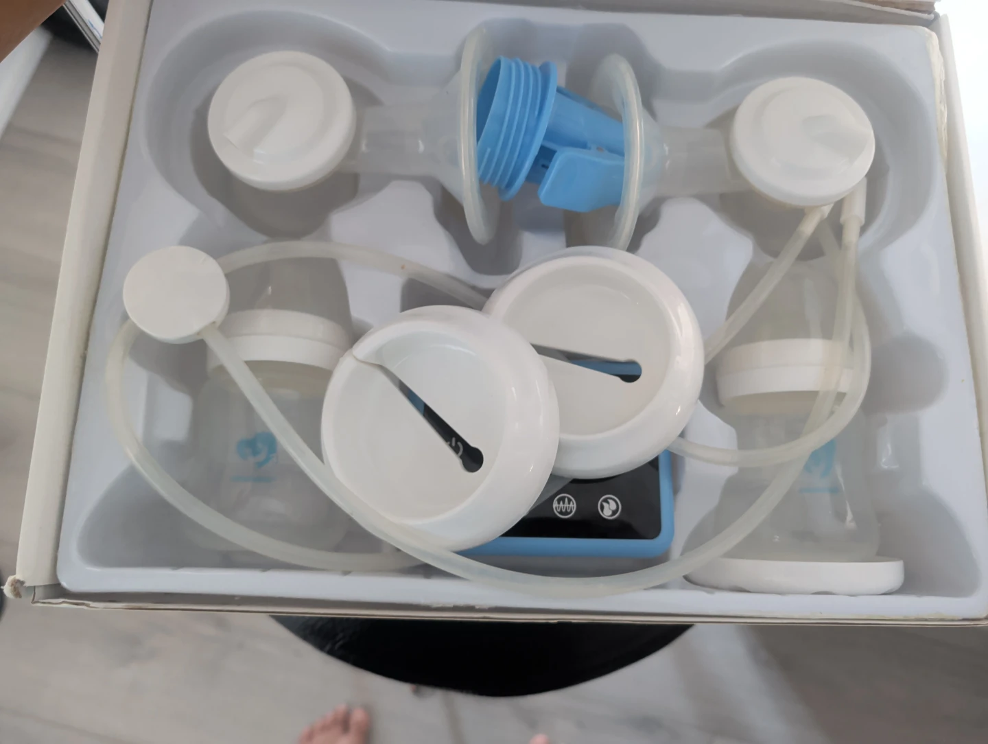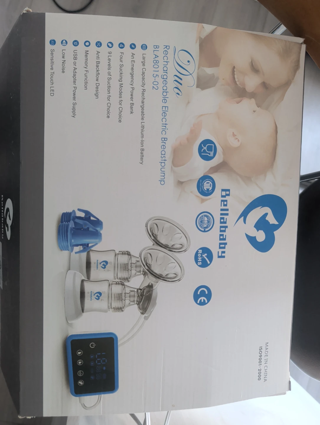 This is a Bellababy rechargeable electric breastpump, model BLA8015-02. It features a large capacity rechargeable lithium-ion battery and sensitive touch LED. The breastpump has 9 levels of suction and 4 modes for choice, with anti-backflow design and memory function. It includes USB or adapter power supply and is low noise.