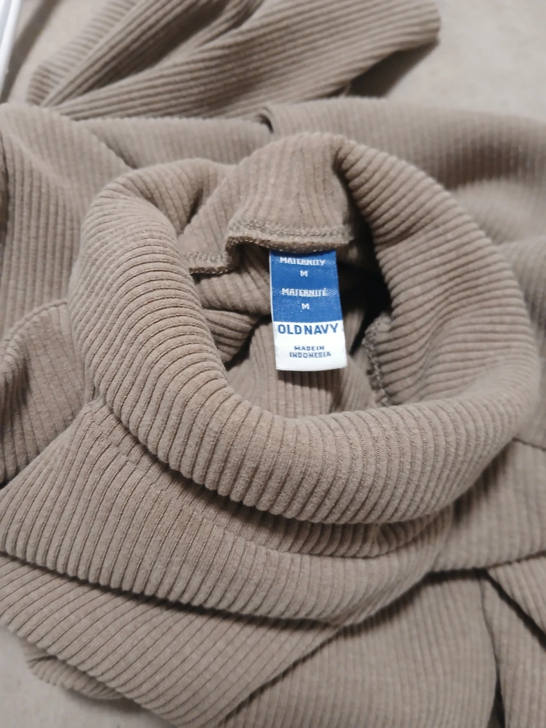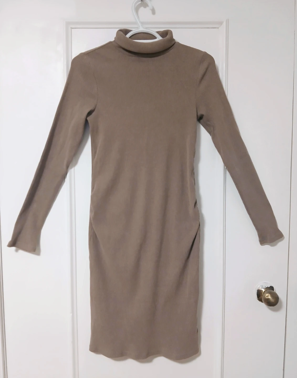 This is an Old Navy maternity turtleneck dress in a size medium. It's a ribbed fabric in beige brown colour. Size Maternity Medium. Available for pick up in Meadowvale area, closest intersection Brittania and Glen Erin