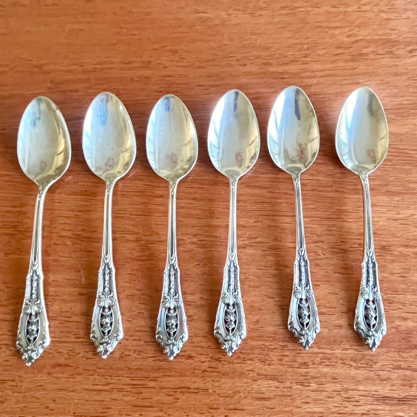Set of six vintage Wallace RosePoint sterling silver teaspoons, each marked with "Wallace Sterling". Each spoon measures 5.5” in length.