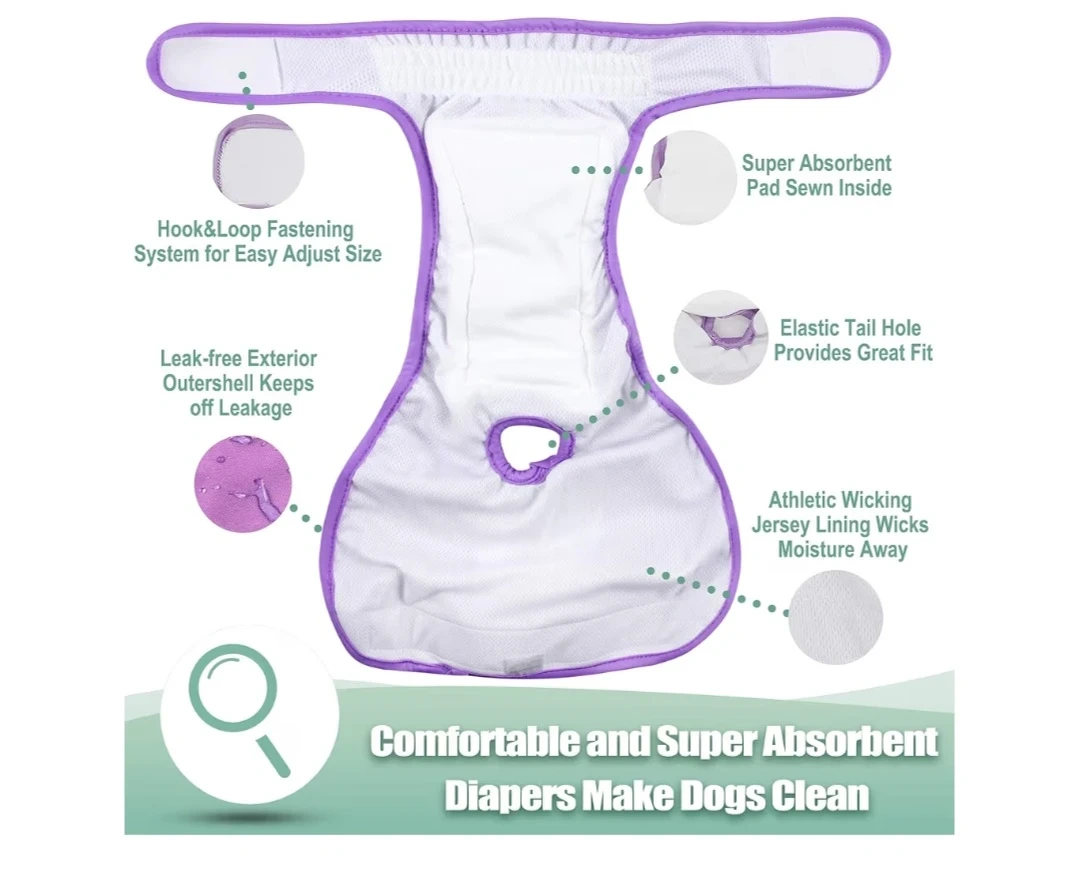 This reusable dog diaper is made with a leak-free exterior and a super absorbent pad inside. It features adjustable snaps and hook & loop for a great fit and a tail hole that provides a better fit. The athletic wicking jersey lining wicks moisture away.