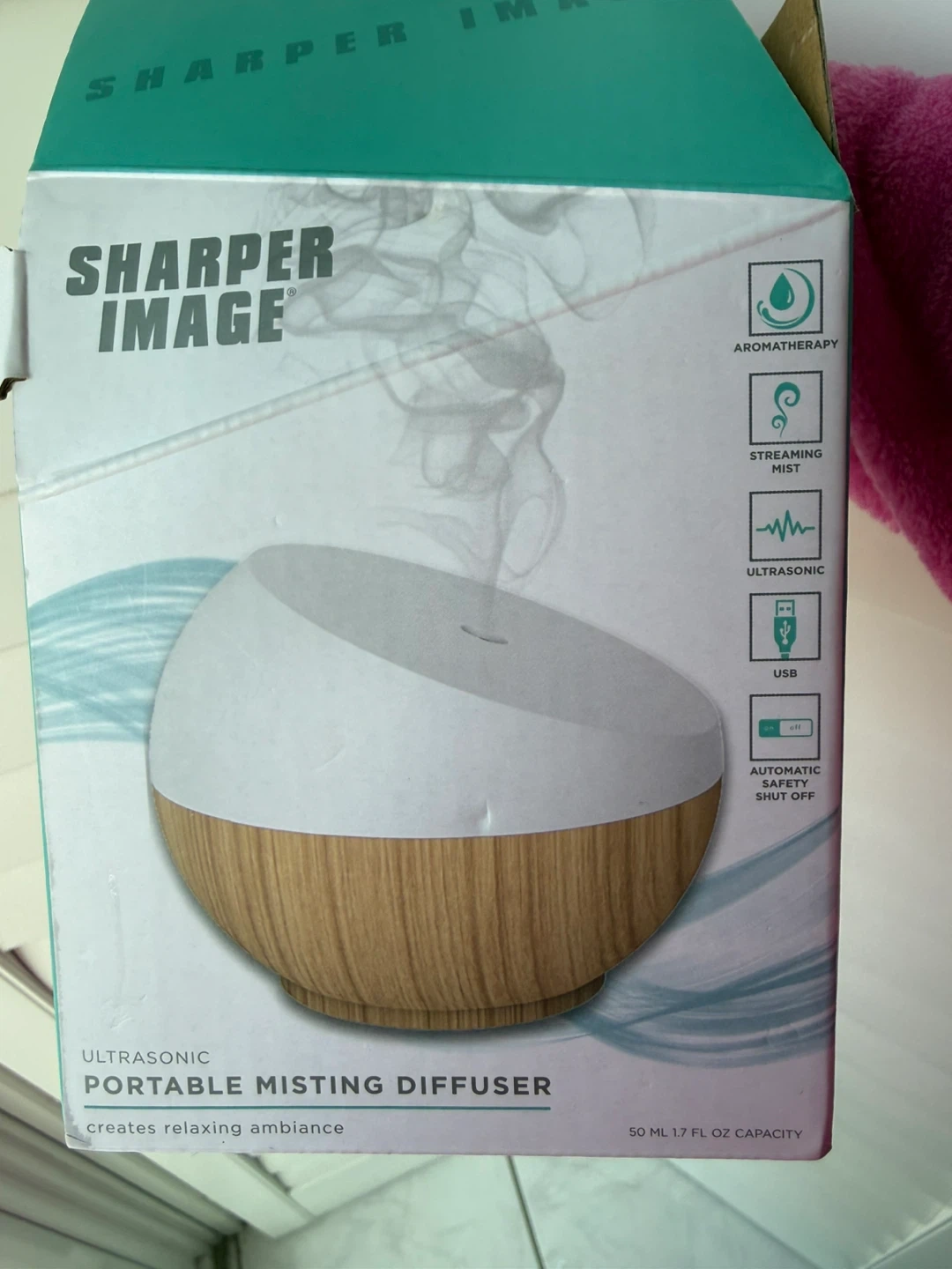 This portable misting diffuser from Sharper Image uses ultrasonic technology. It's designed for aromatherapy and features automatic safety shut-off. Includes USB power cord. 50 mL (1.7 fl oz) capacity.