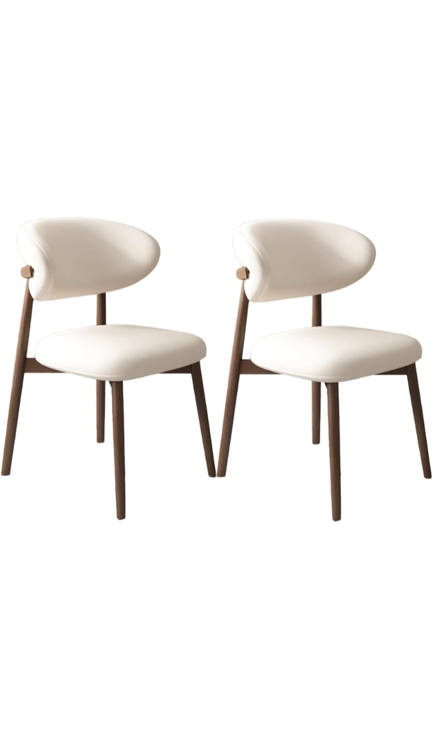 Two dining chairs with comfortable white upholstered seats and curved backs. They feature dark wood tapered legs for a modern look. Ideal for a dining room or accent seating.