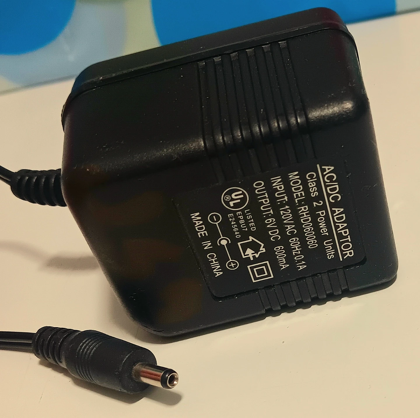 This is a used AC/DC power adaptor, model RHD060060090, that provides an output of 6V DC at 600mA, with an input of 120V AC at 60Hz 0.4A. It's in great working condition, ready to power your compatible devices.