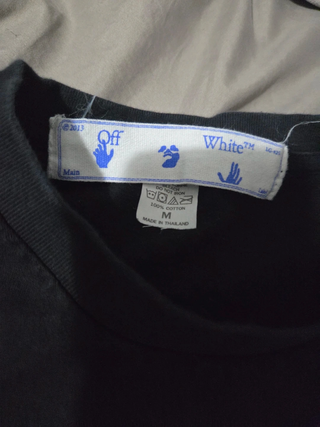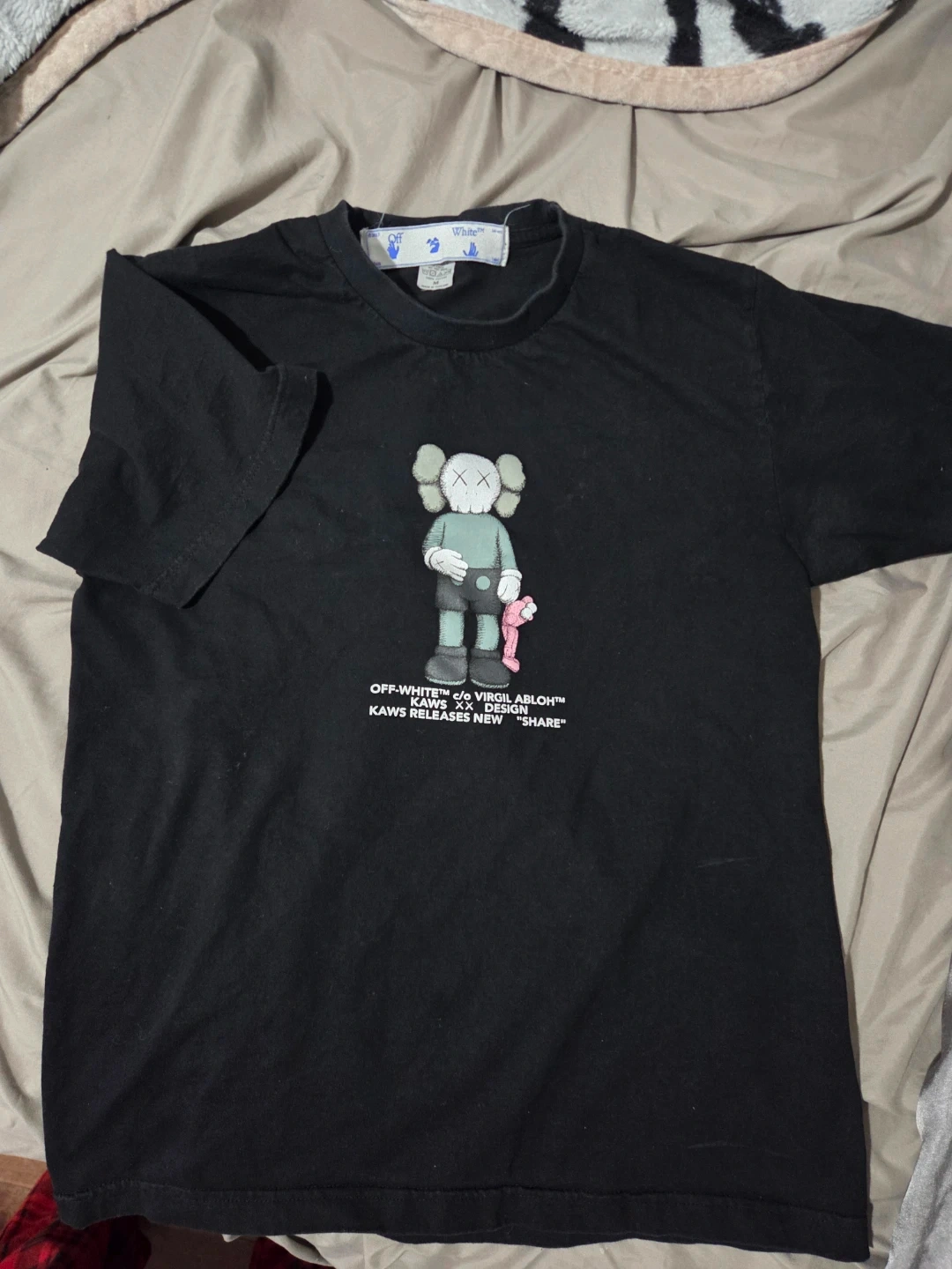 This is an Off-White x Kaws t-shirt. It's black and size medium. 100% cotton material.