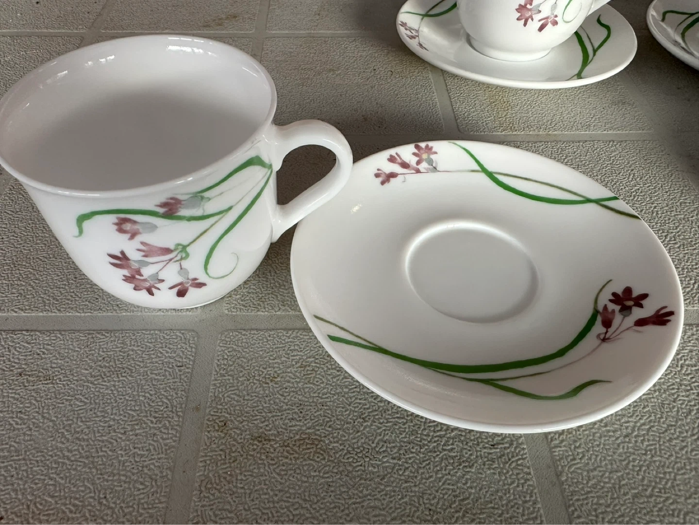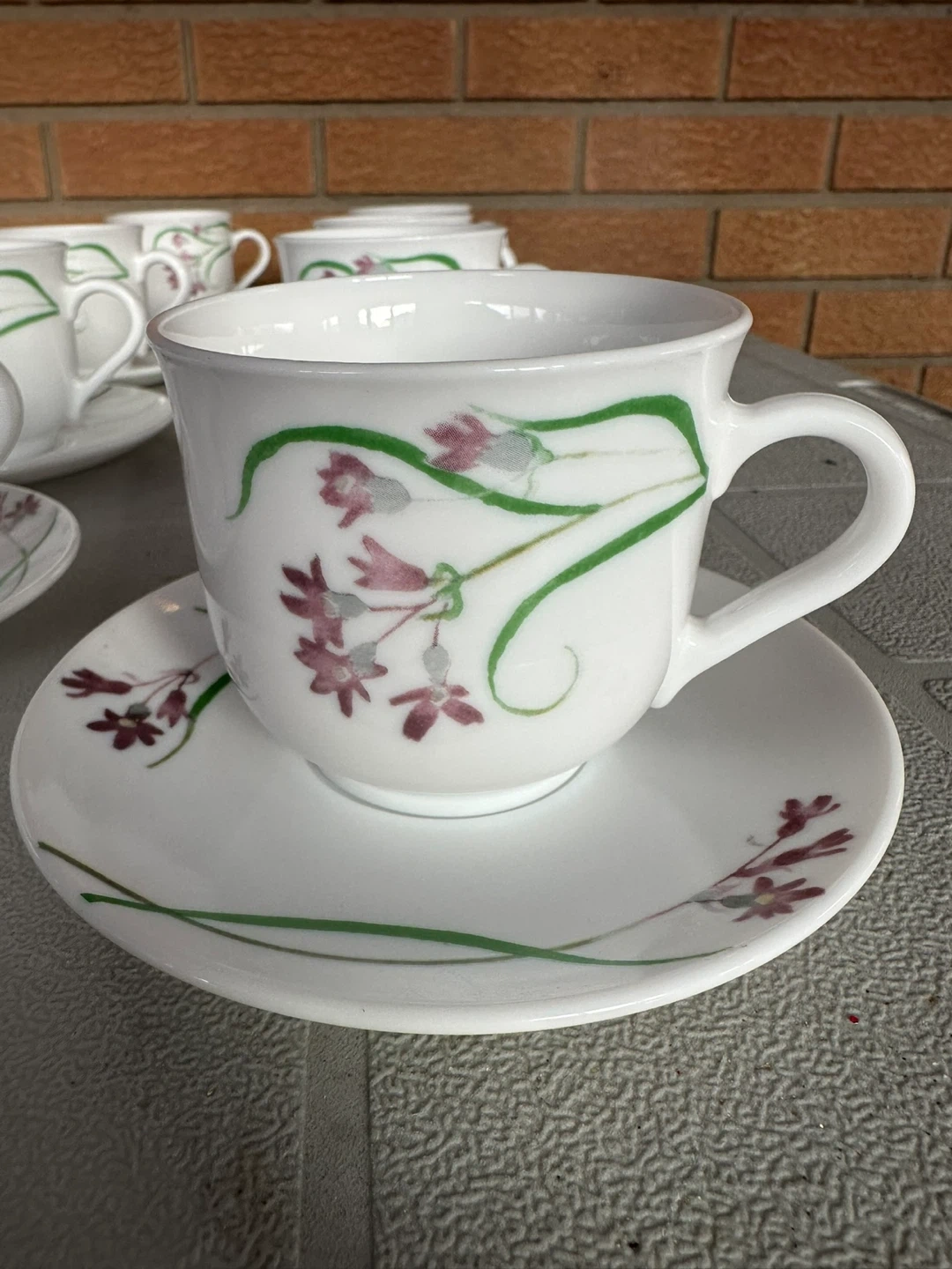 A set of 12 white cups and saucers with a delicate floral design. Made in France, microwave and dishwasher safe. Perfect for serving guests or everyday use! Never been used