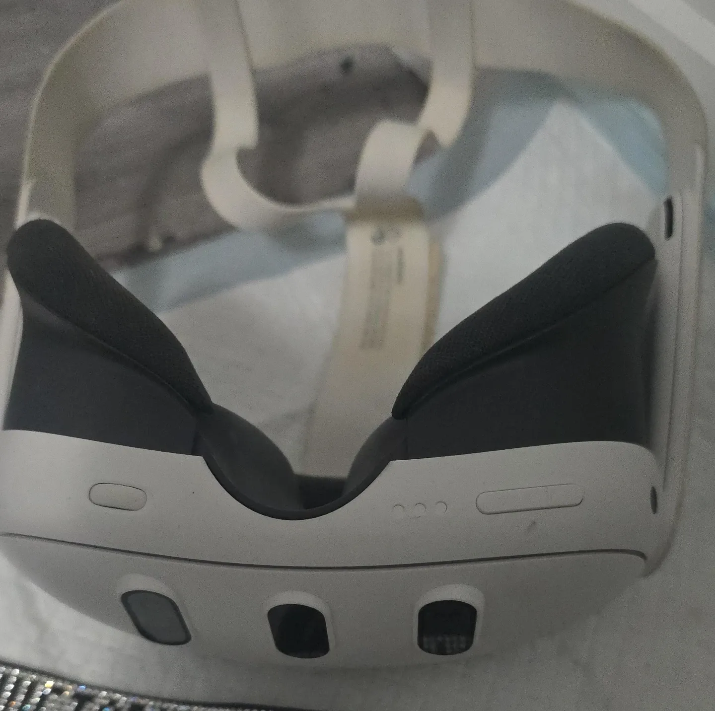 This is a white virtual reality headset. It features a comfortable padded design and adjustable straps for a secure fit. The headset has multiple sensors and buttons for interaction.