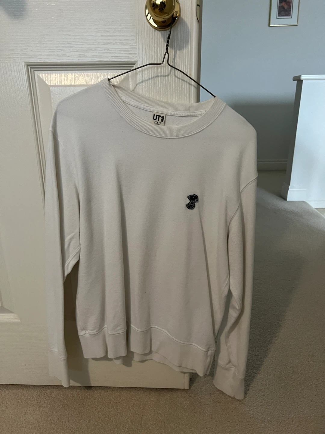 Uniqlo UT crewneck sweatshirt with a Snoopy graphic on the front. It's a comfortable white long-sleeve top. Material is soft cotton blend.