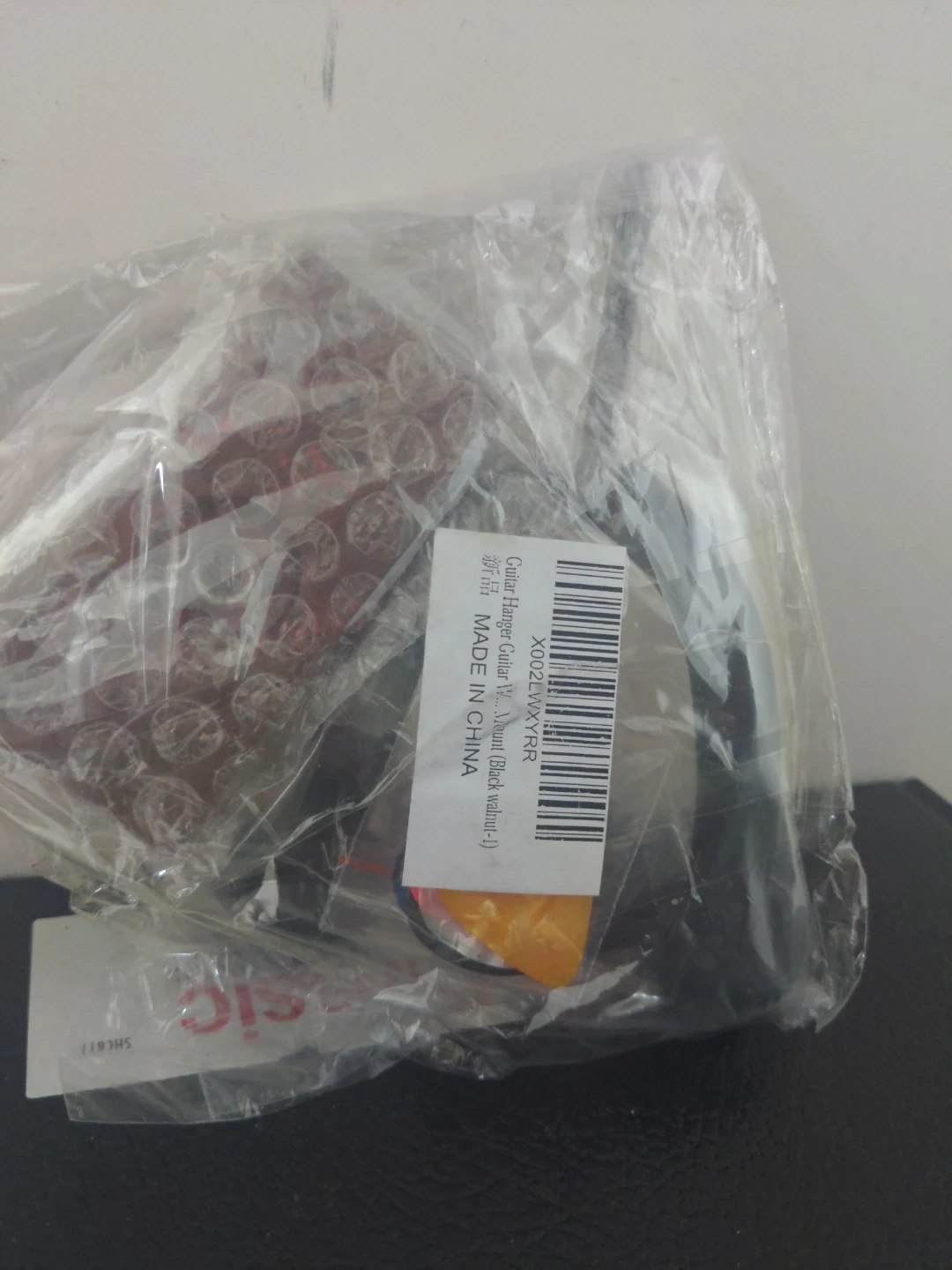 Guitar wall hanger mount in a black walnut finish. Includes mounting hardware.