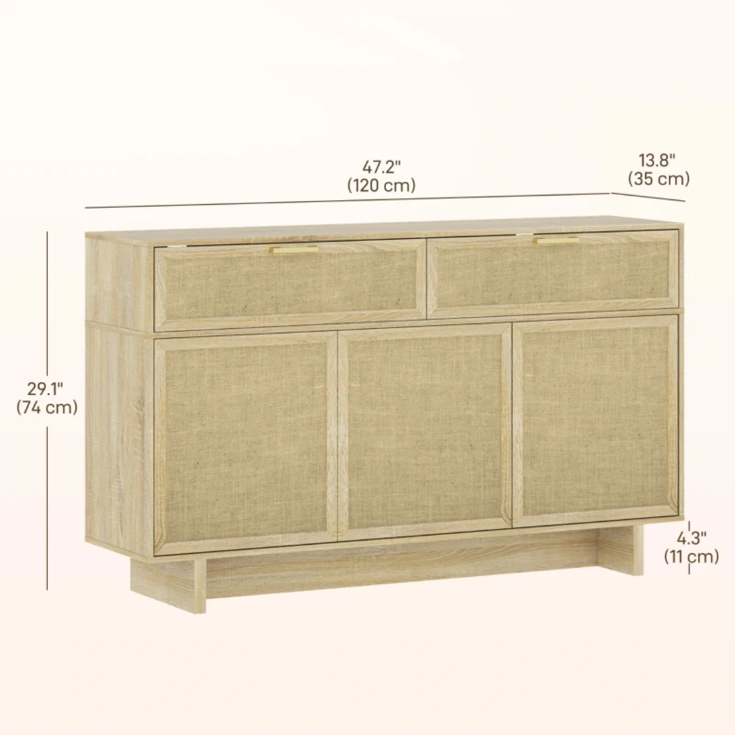 This accent cabinet features a Boho charm with linen panels, adding a touch of Bohemian aesthetics to any room. It has golden handles and an elevated base, plus protective foot pads. The anti-tippling design ensures extra safety