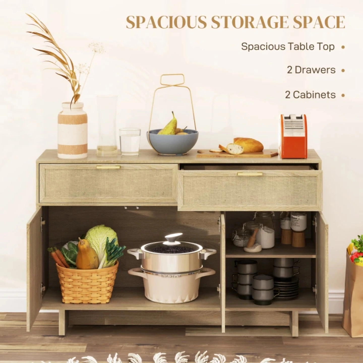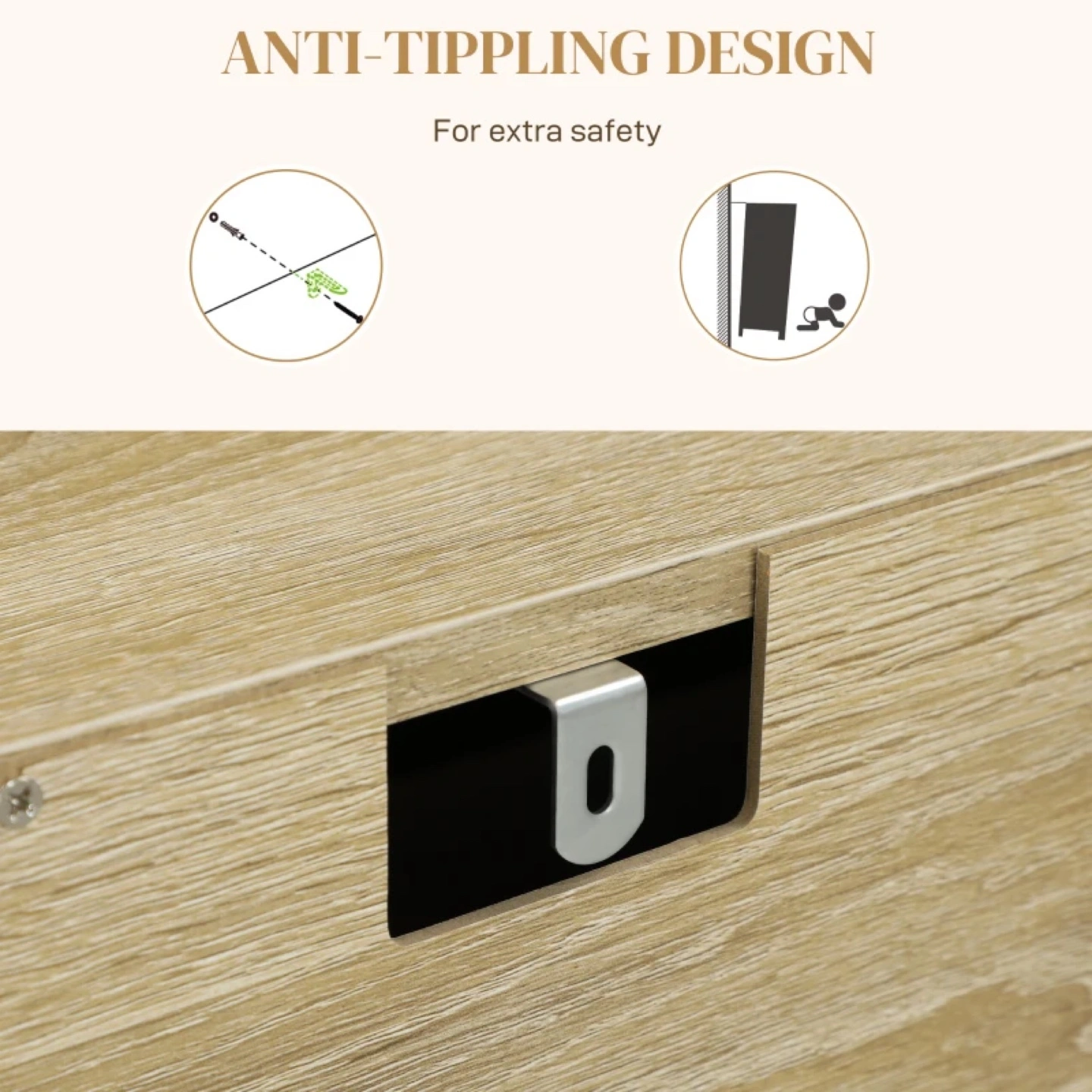 This accent cabinet features a Boho charm with linen panels, adding a touch of Bohemian aesthetics to any room. It has golden handles and an elevated base, plus protective foot pads. The anti-tippling design ensures extra safety