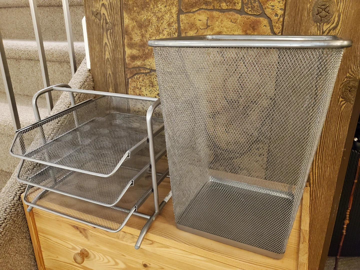 Mesh desk organizer set featuring a 3-tier document tray and a matching waste bin. Both pieces are made of durable silver-toned mesh metal. This set helps keep your workspace tidy and organized.