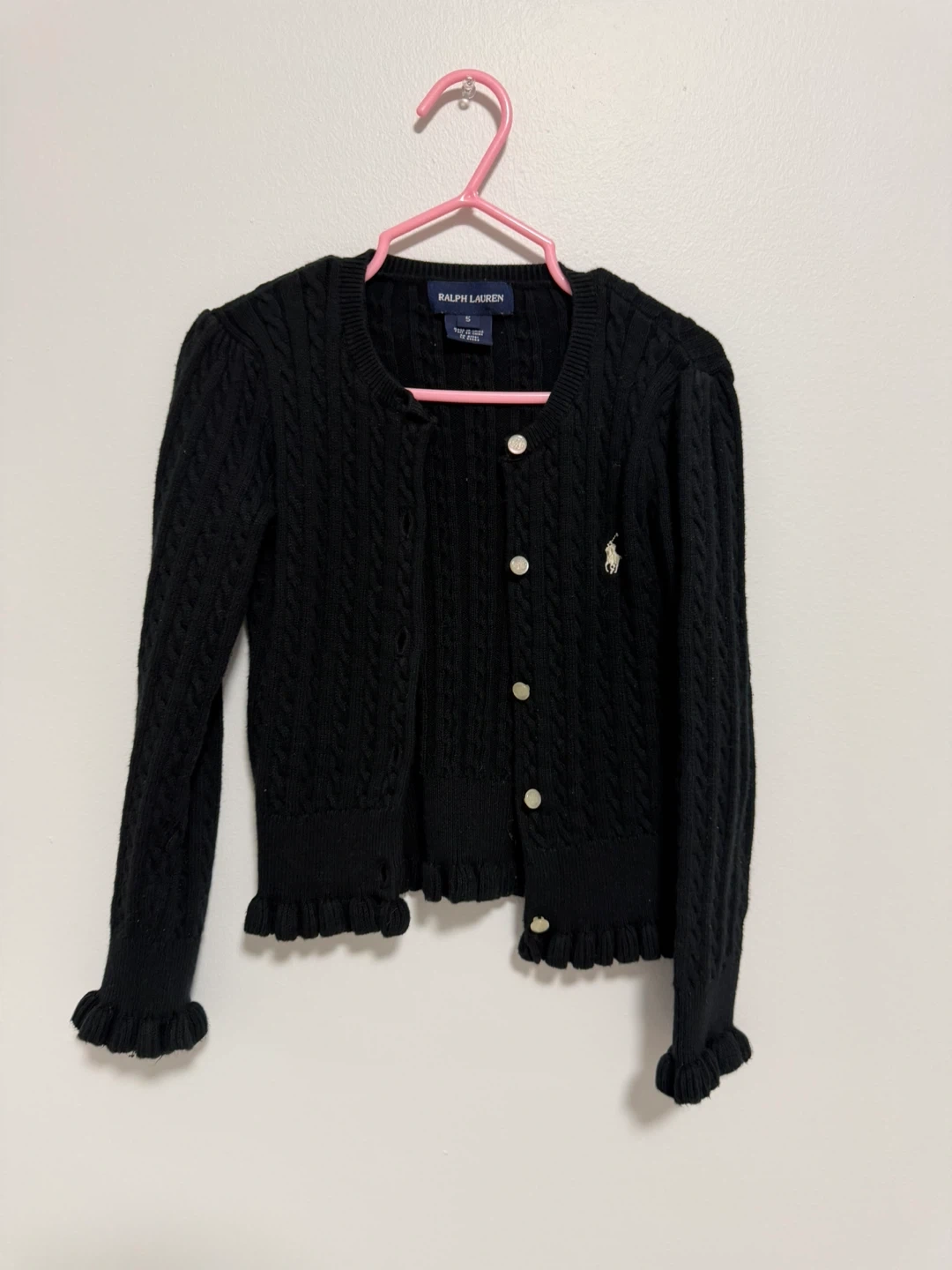 This black Ralph Lauren cable knit cardigan is a size 5. It features a classic button-down front and adorable ruffle detailing at the hem and cuffs. It's perfect for layering over outfits to add a touch of style.