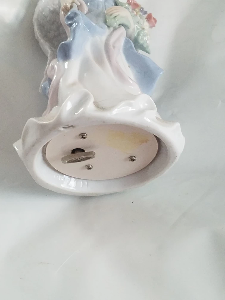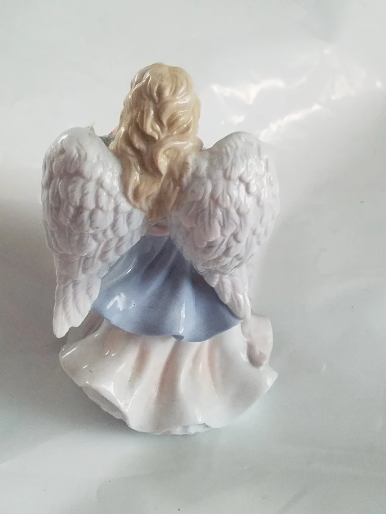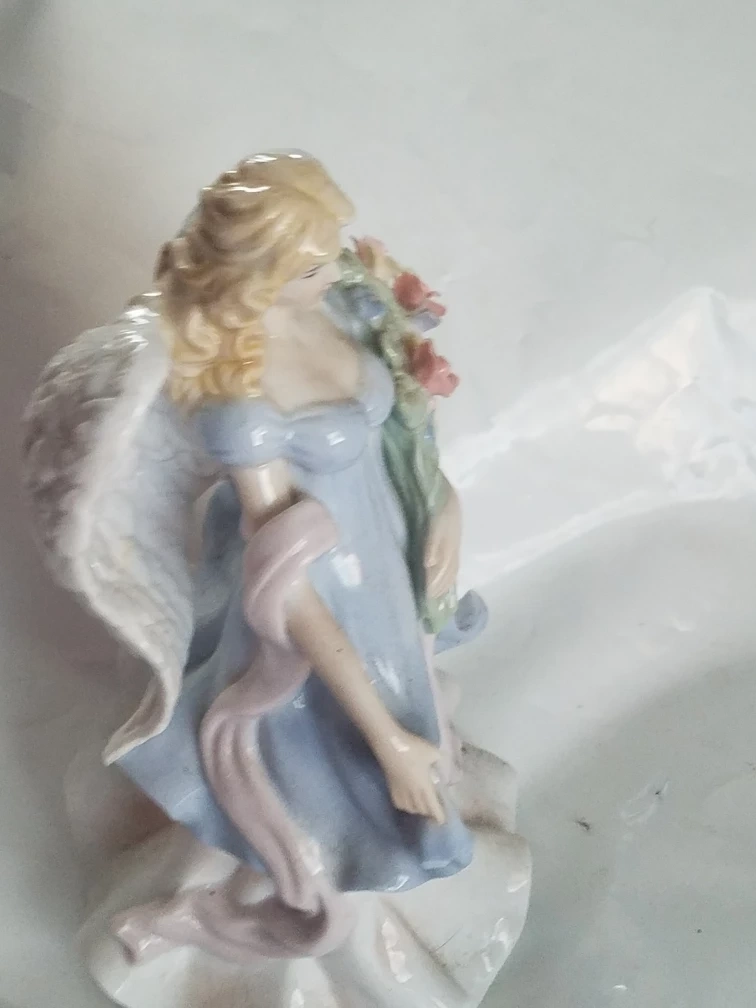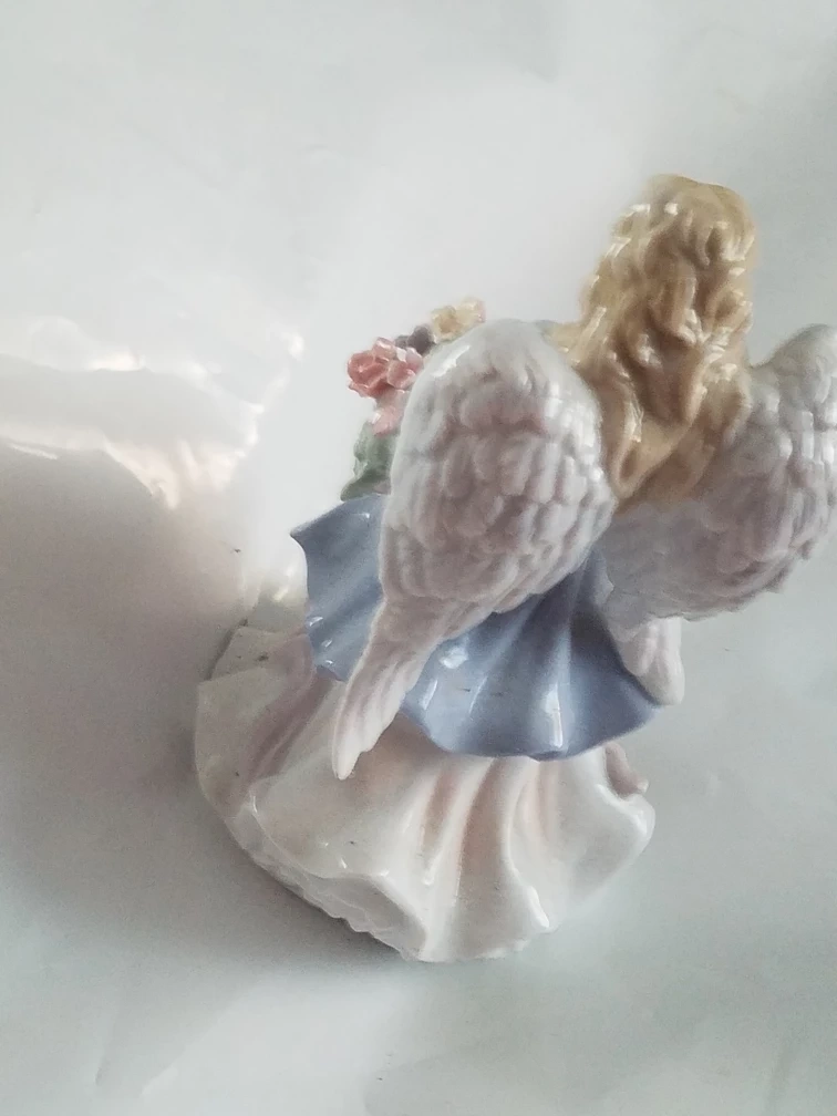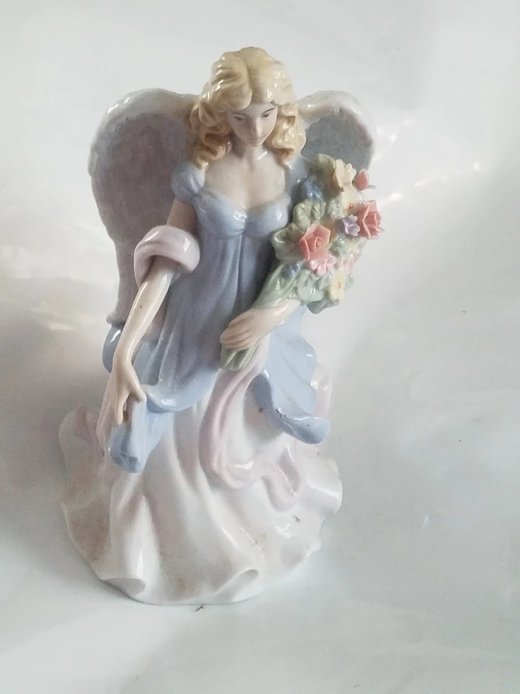 This sweet ceramic angel figurine holds a bouquet of flowers. It has a music box mechanism on the bottom. This piece would make a lovely decorative accent!