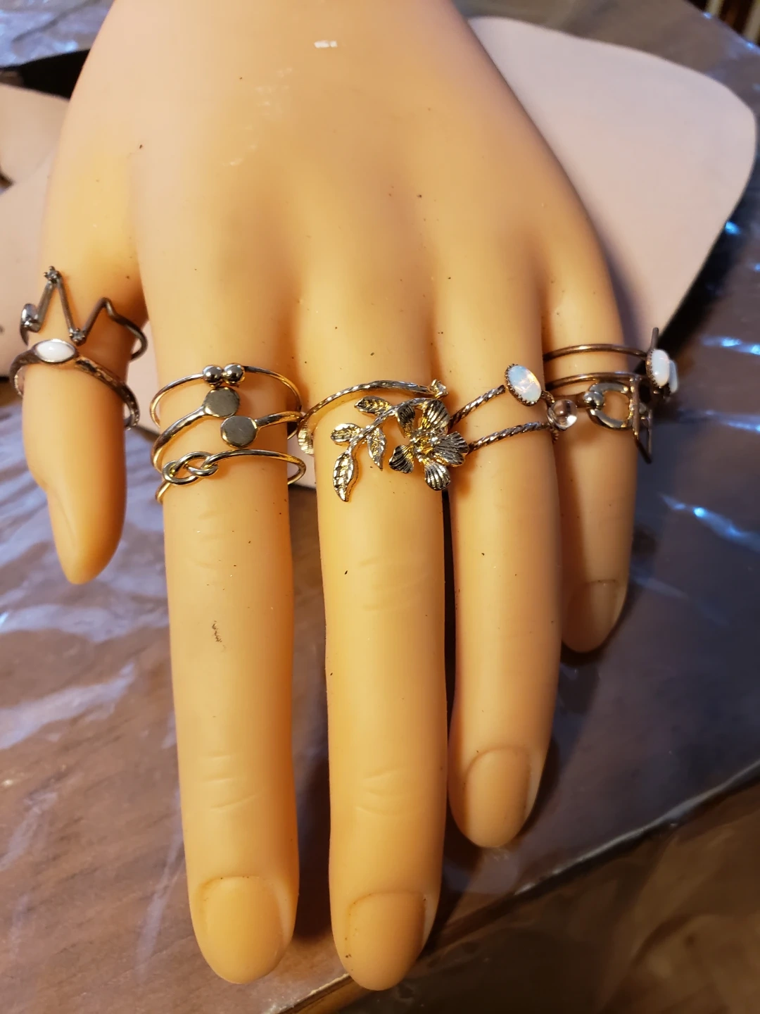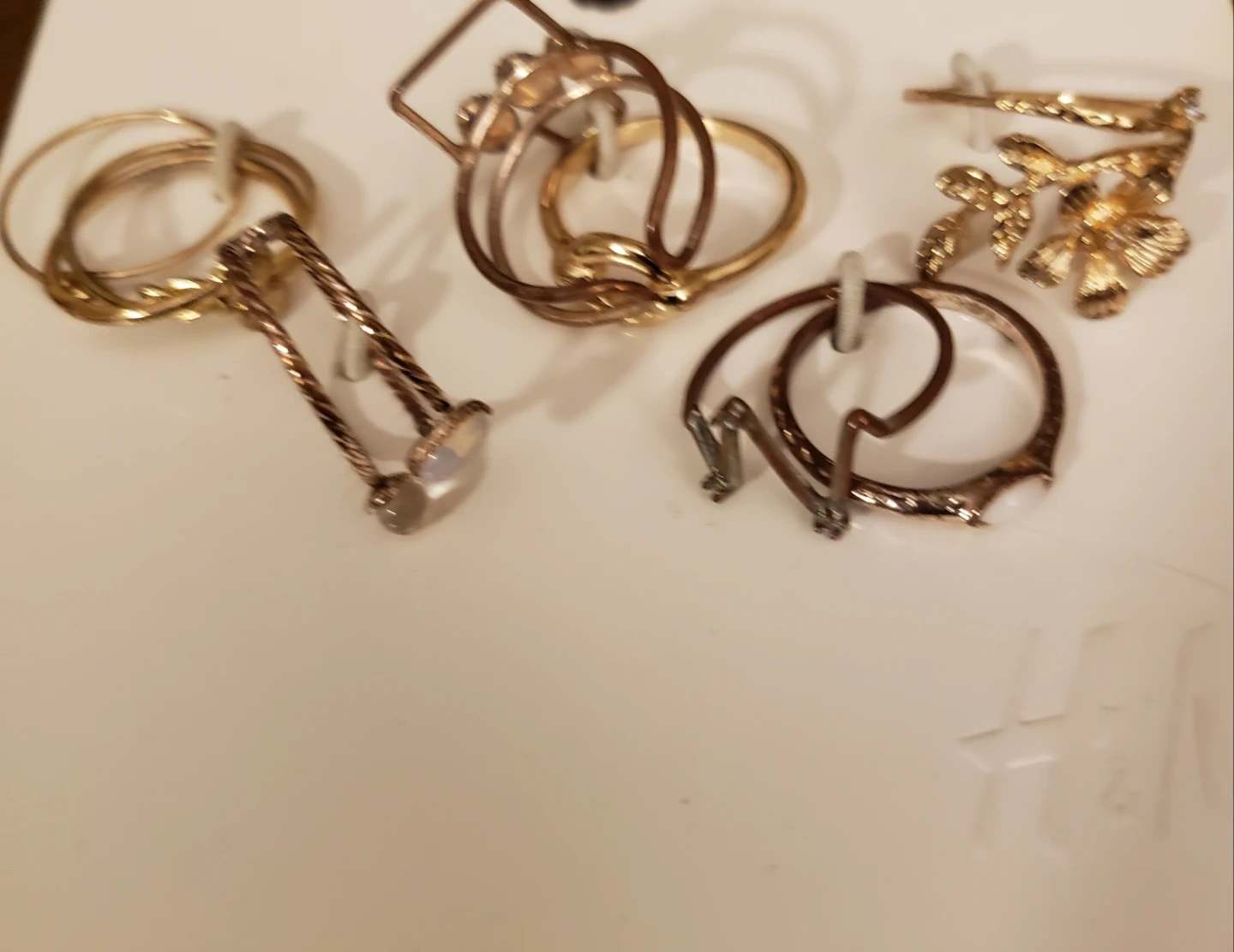 This is a set of assorted midi rings from H&M. It includes rings with various designs like knots, flowers, and stones. This set is perfect for layering or wearing individually!