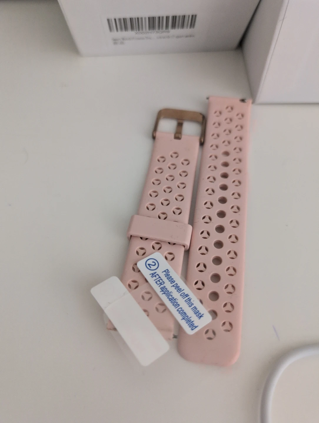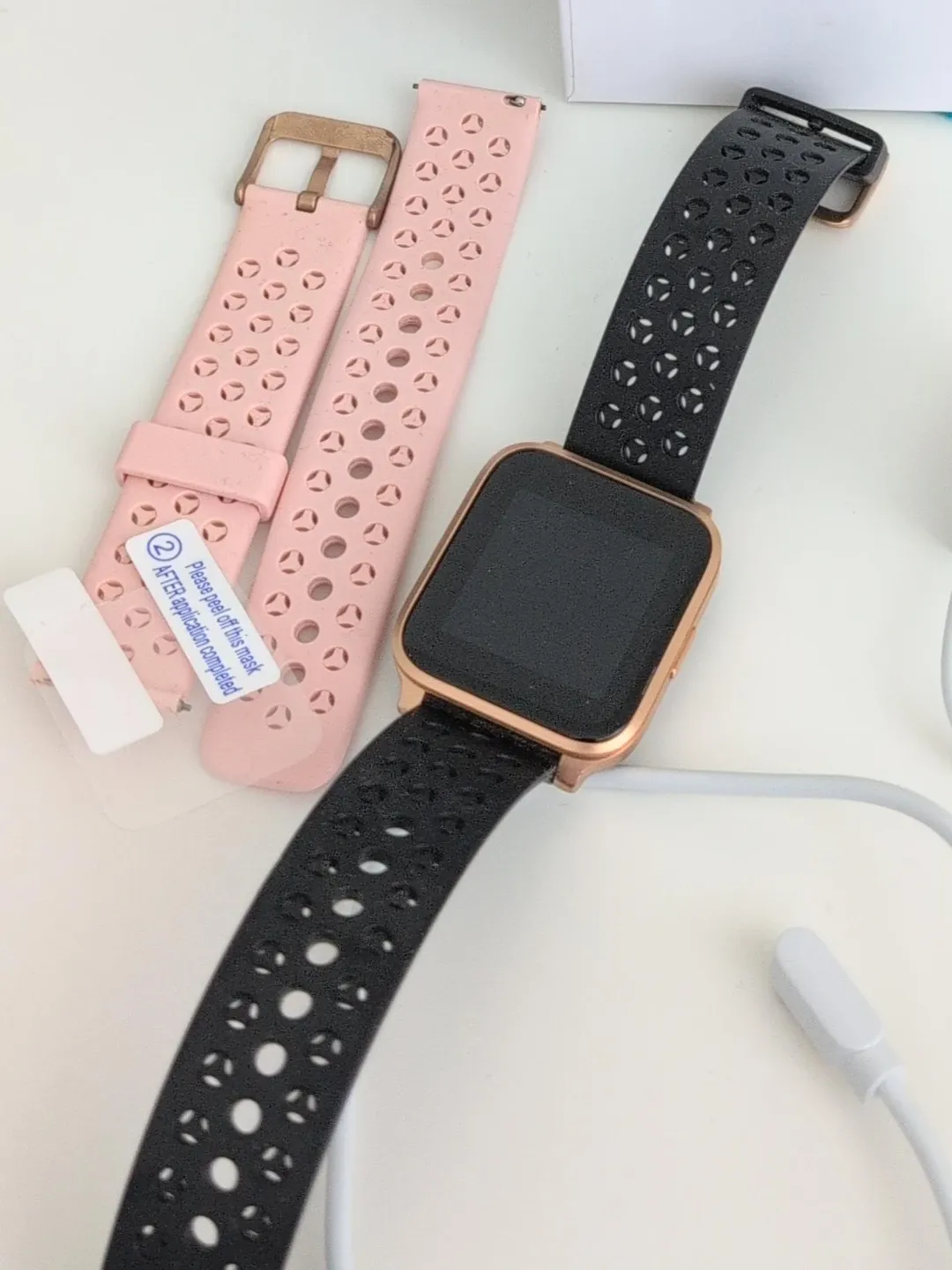 This ZKREATION smart wristband is a fitness tracker. It comes with a rose gold watch case and a black perforated band. An extra pink band is also included. A USB charging cable is provided.