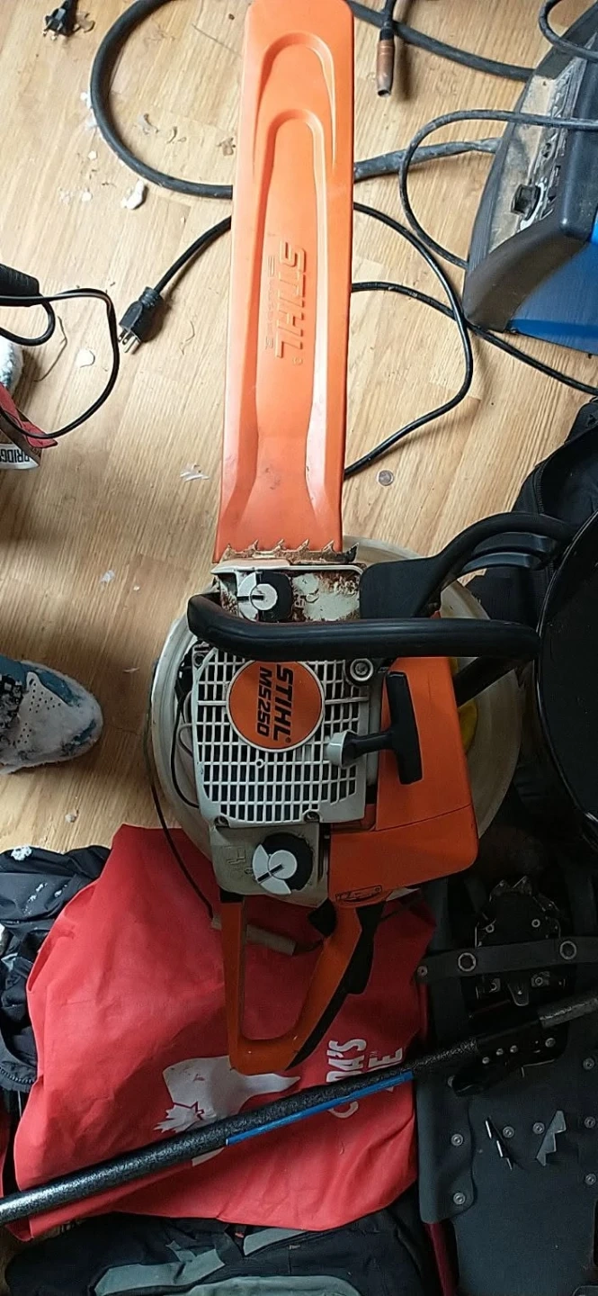 This is a STIHL MS 250 chainsaw. It's a powerful tool for cutting wood. It features a durable design for reliable performance.