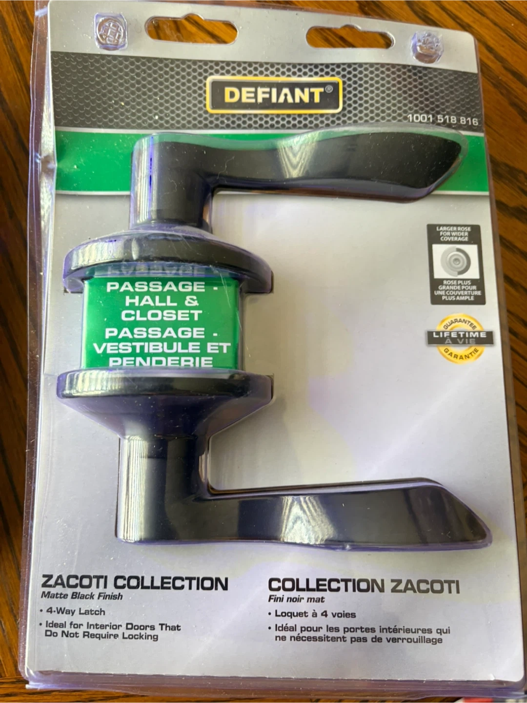 This is a Defiant Zacoti Collection passage door lever. It features a matte black finish and a 4-way latch. It's ideal for interior doors that don't require locking. This lever provides passage functionality. Cash only