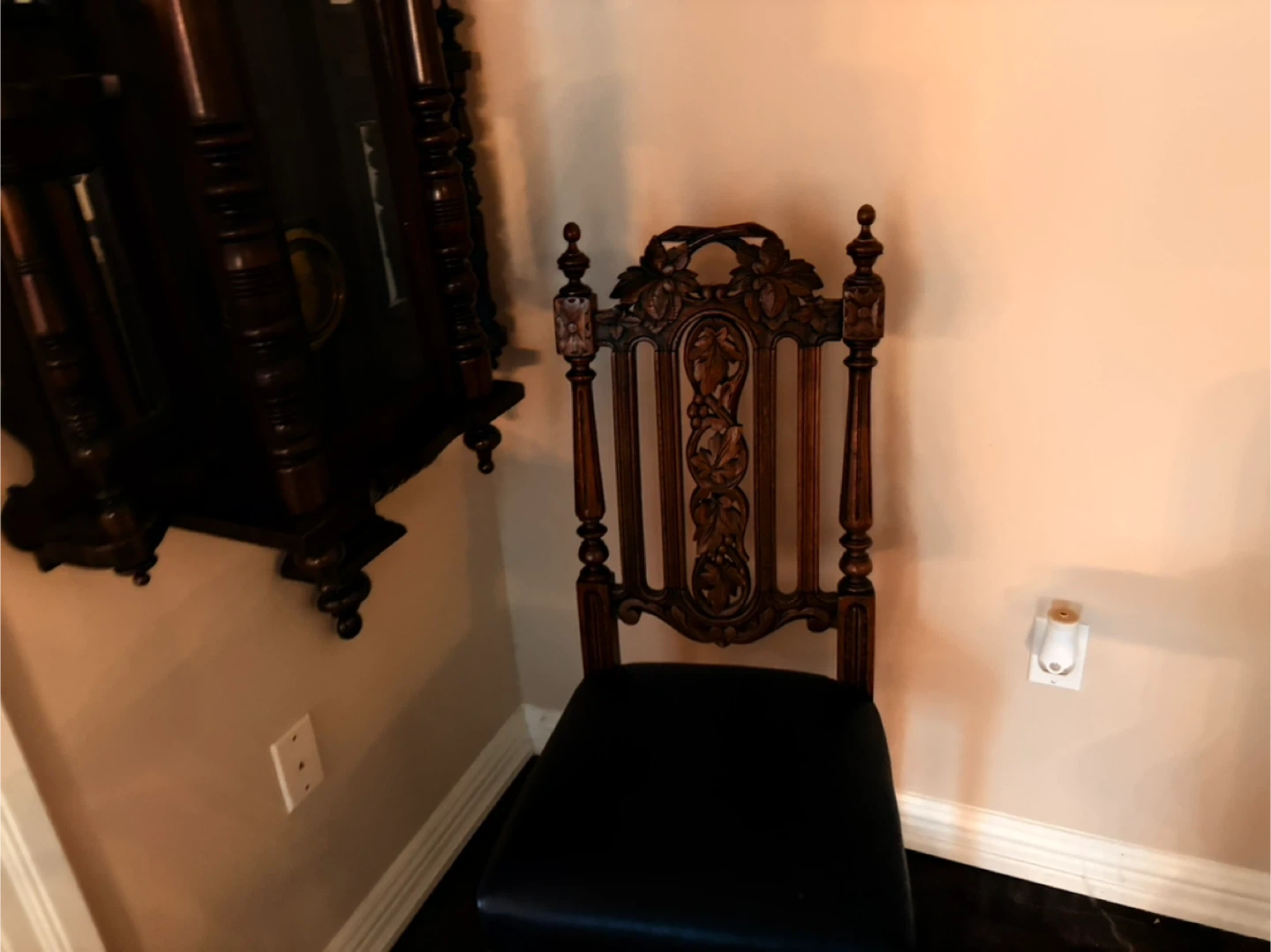 A beautifully carved antique wood dining chair with a black leather