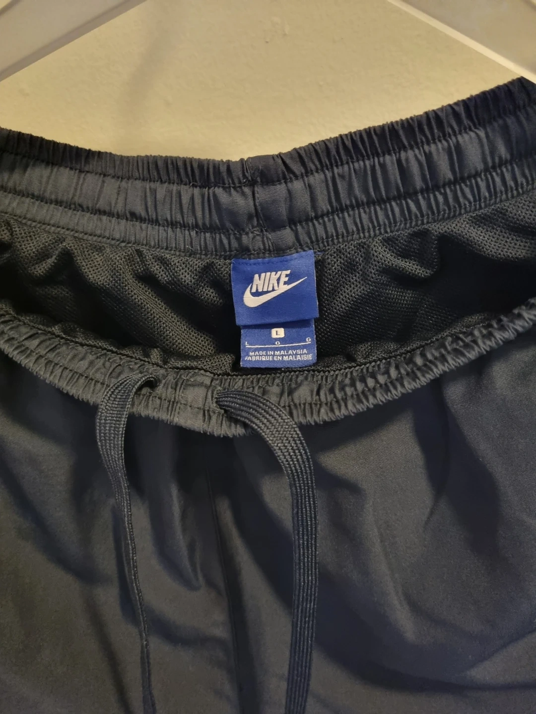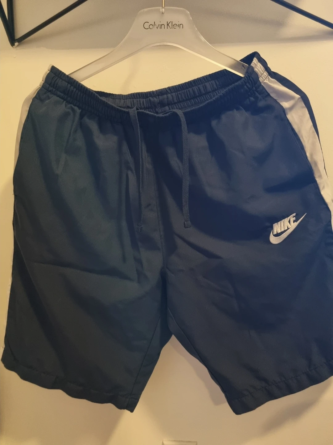 Nike athletic shorts in a navy colour with white side stripes.