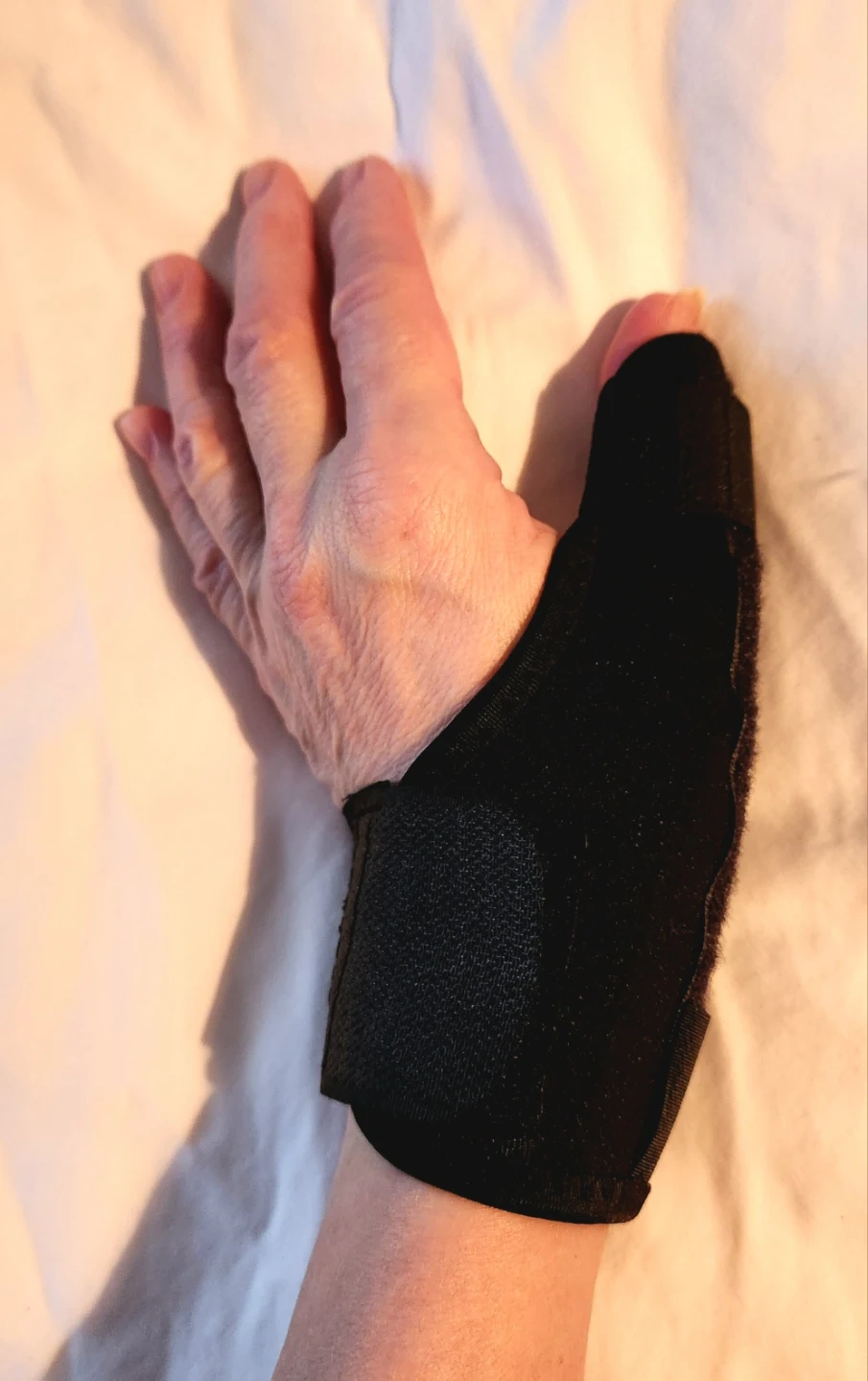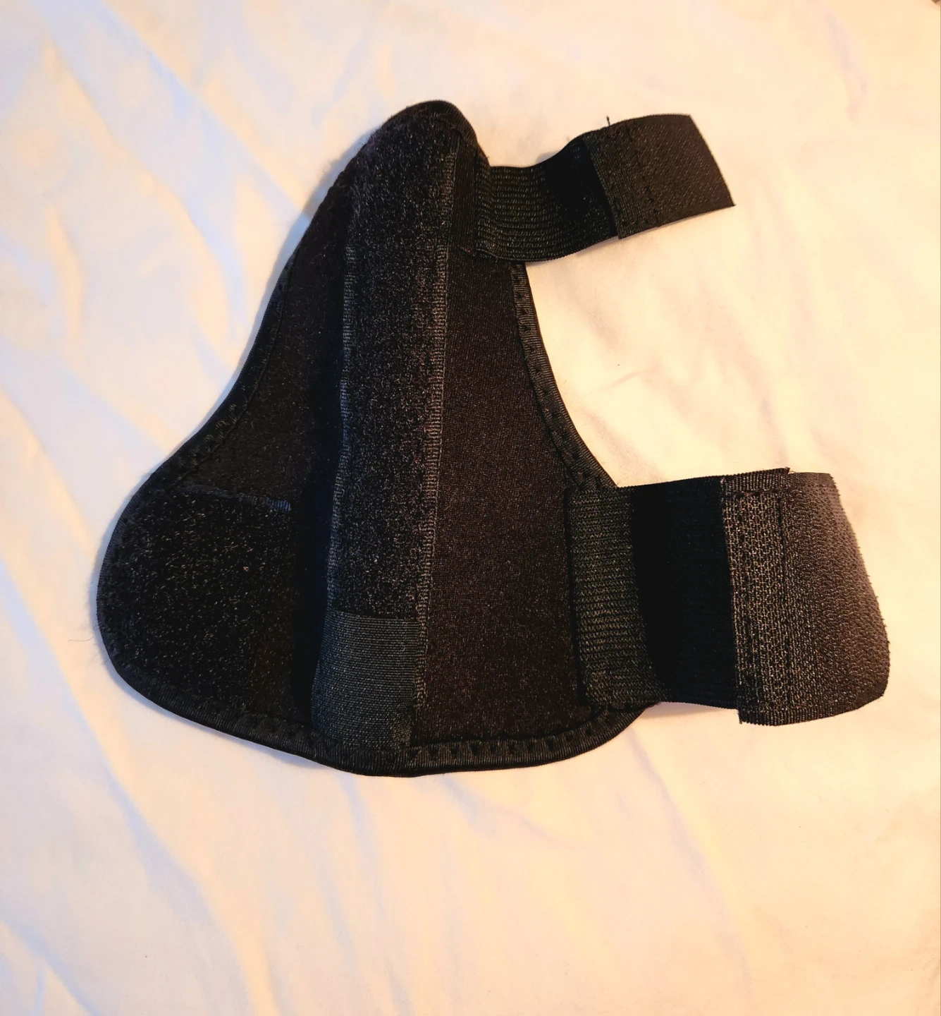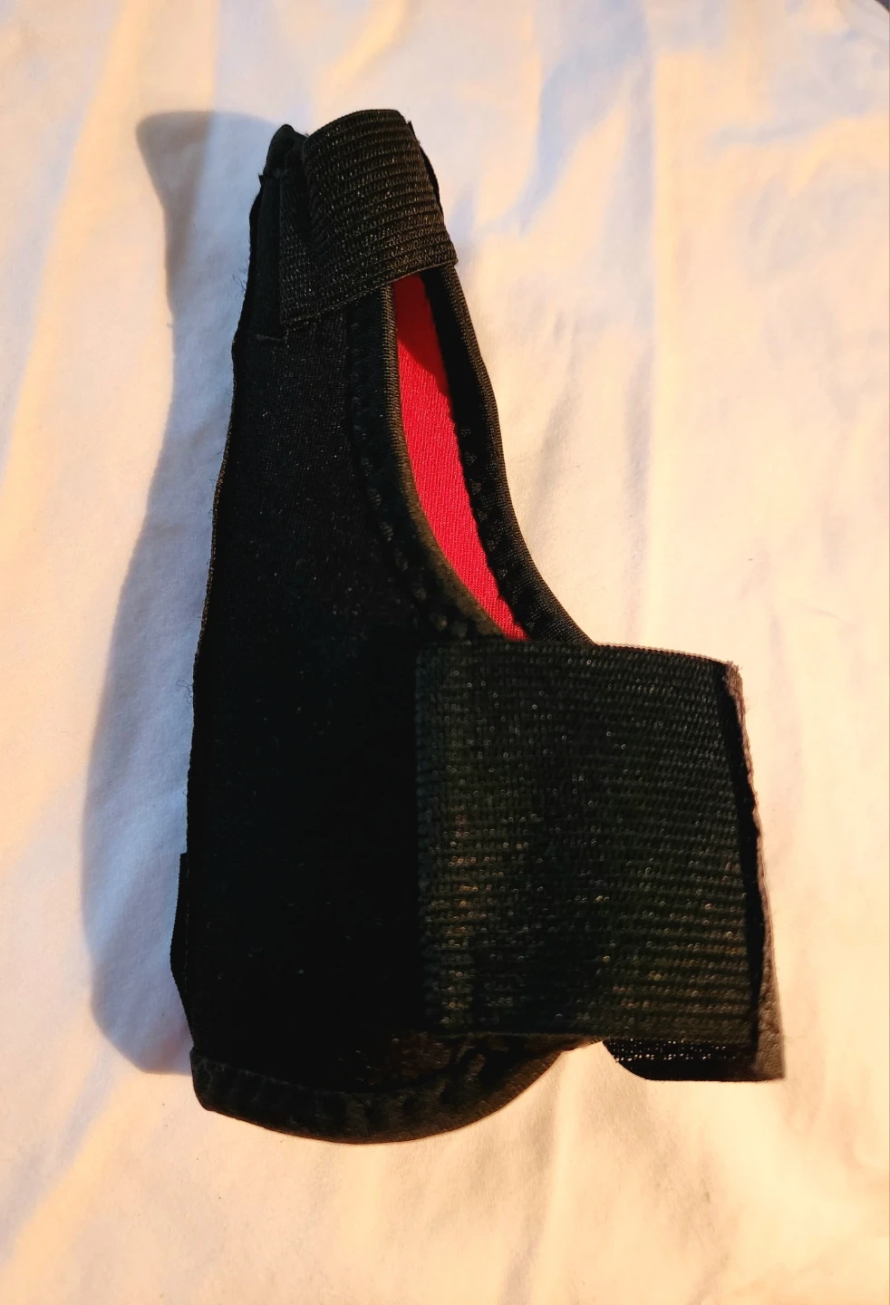 This new black thumb spica splint brace is designed for comfort and support. It features adjustable straps for a secure fit and a red inner lining. It helps immobilize the thumb and wrist.