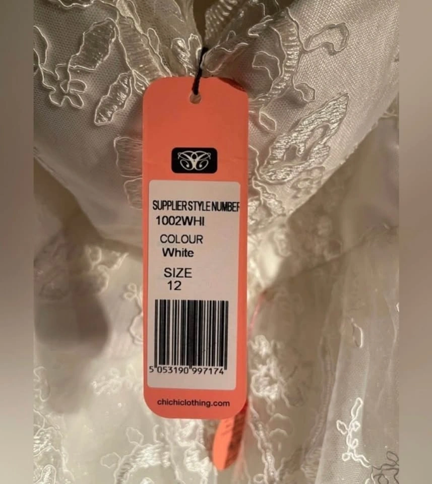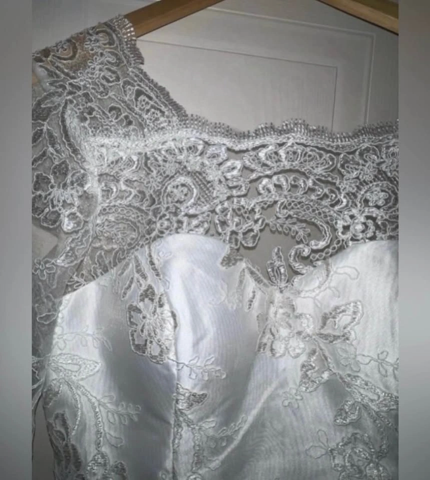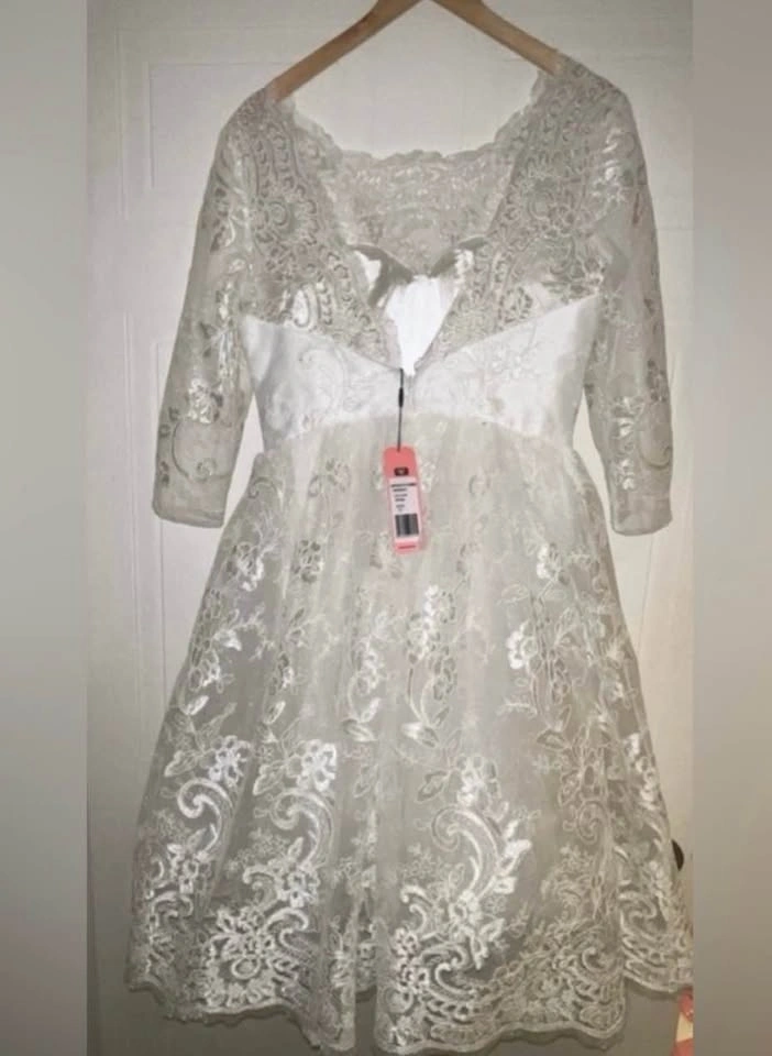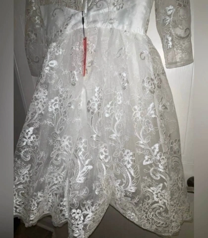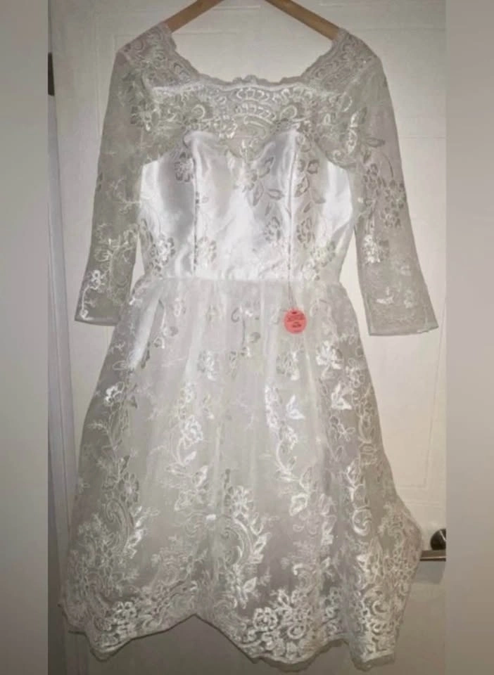 New with tags, in excellent condition. Size UK 12, US 8. Stunning white embroidered wedding dress with intricate floral patterns and shimmering details. Features sheer mesh embroidered sleeves for a classic look.