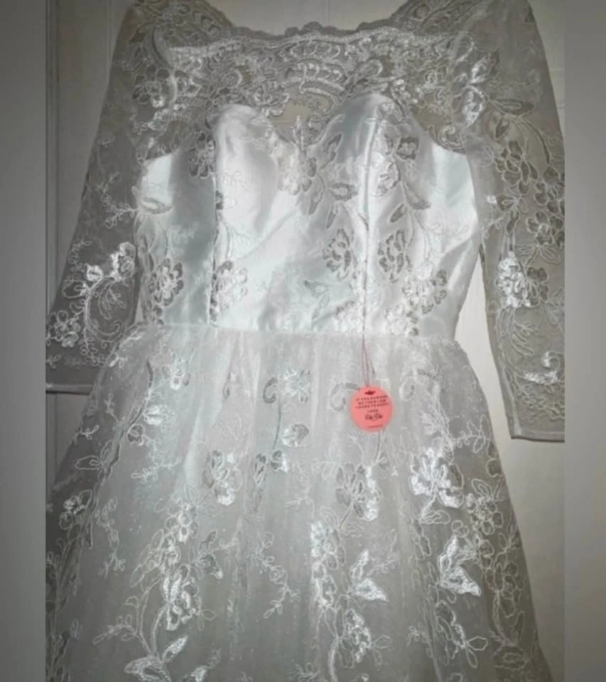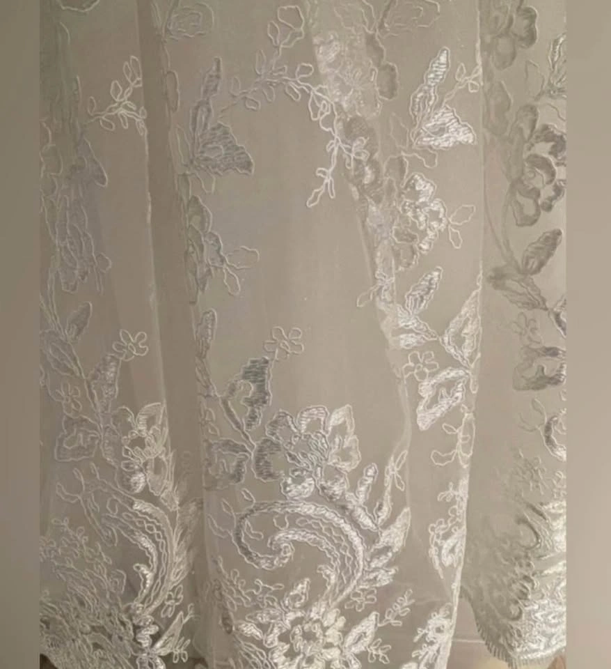 • Fabric: dress features a combination of lace and tulle, with ornate swirls and a soft satin sheen, suggesting a luxurious and detailed design.