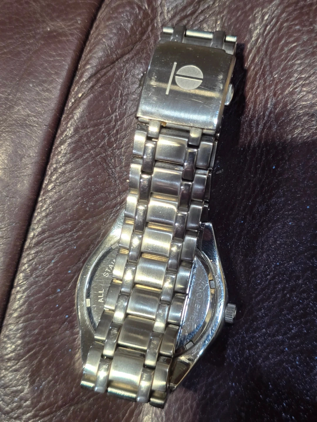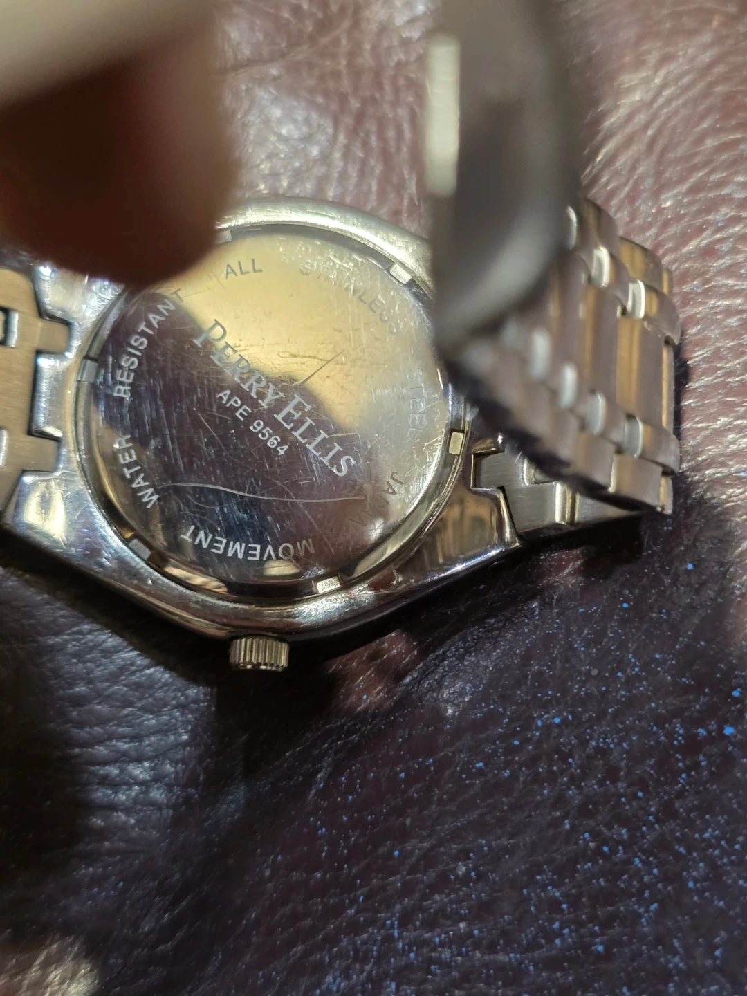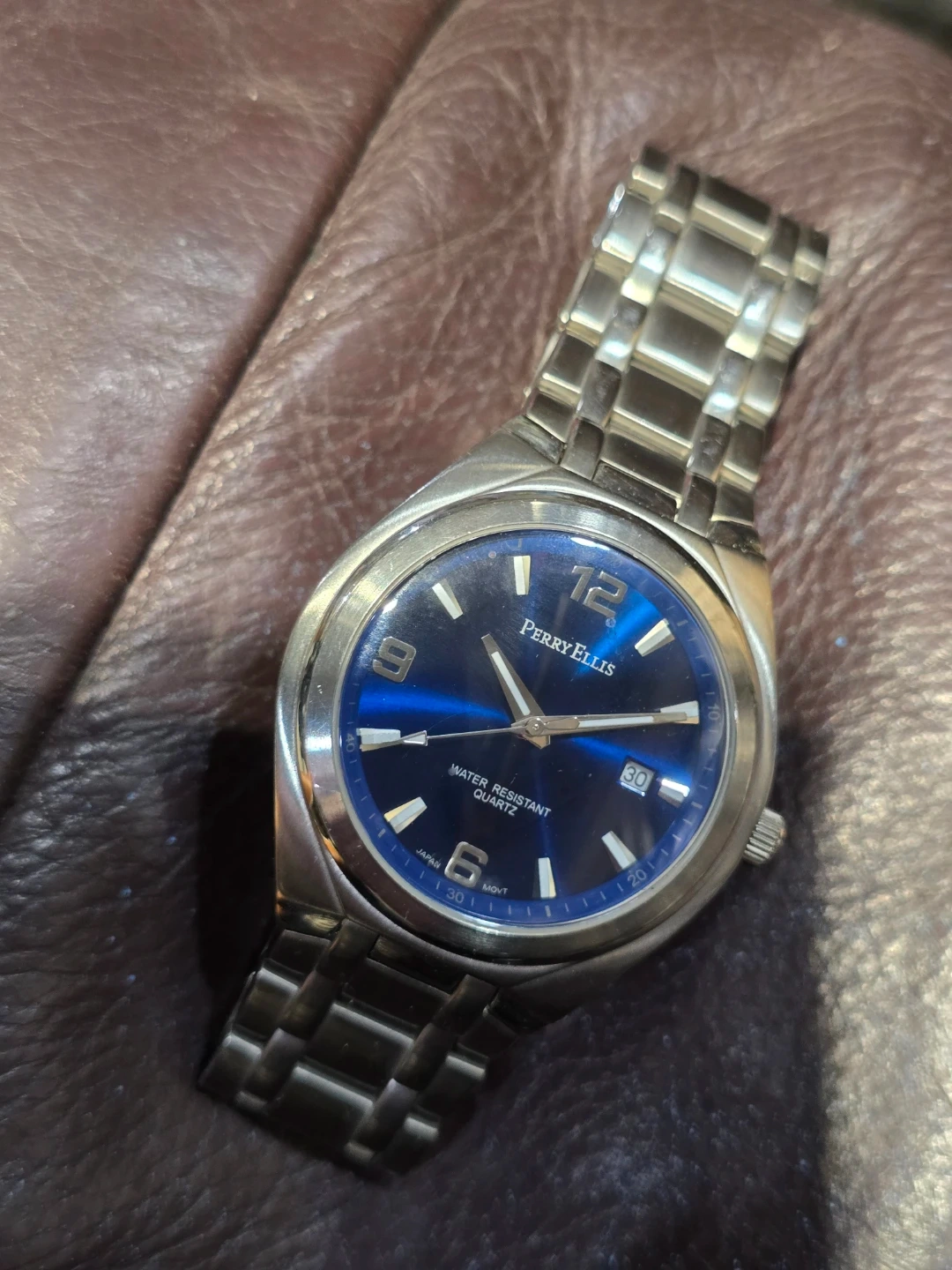Perry Ellis men's watch with a blue dial. It's a water-resistant quartz model with a stainless steel band. Includes date display.