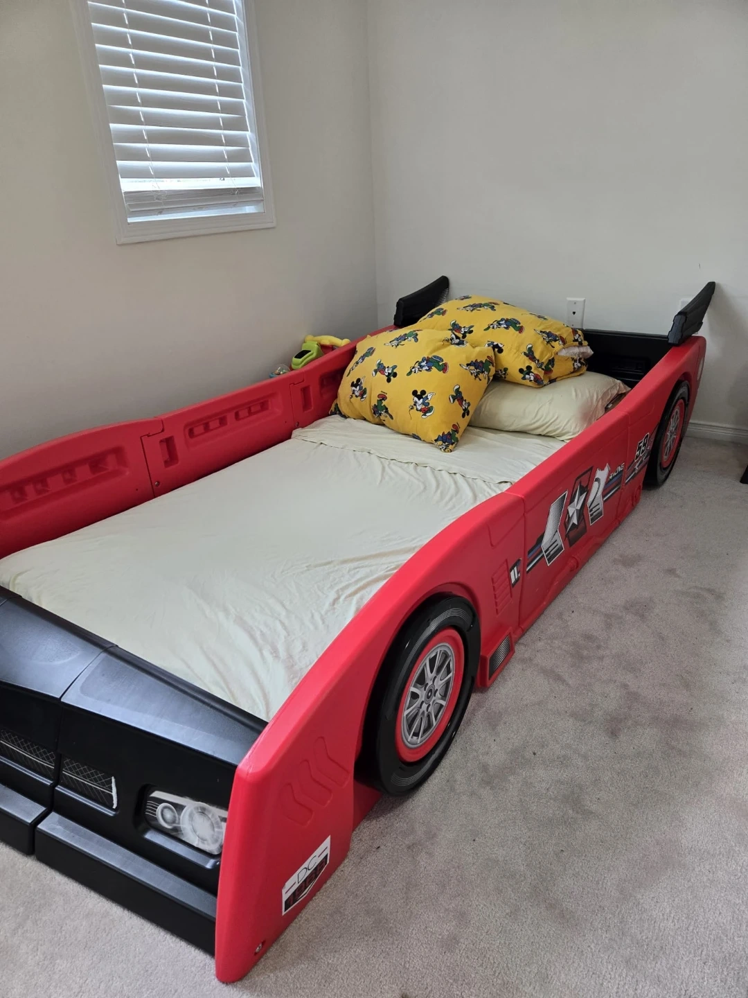 This fun red race car bed is perfect for a child's room. It features a sturdy plastic frame with realistic tire accents. It's designed for a toddler or twin-sized mattress.
