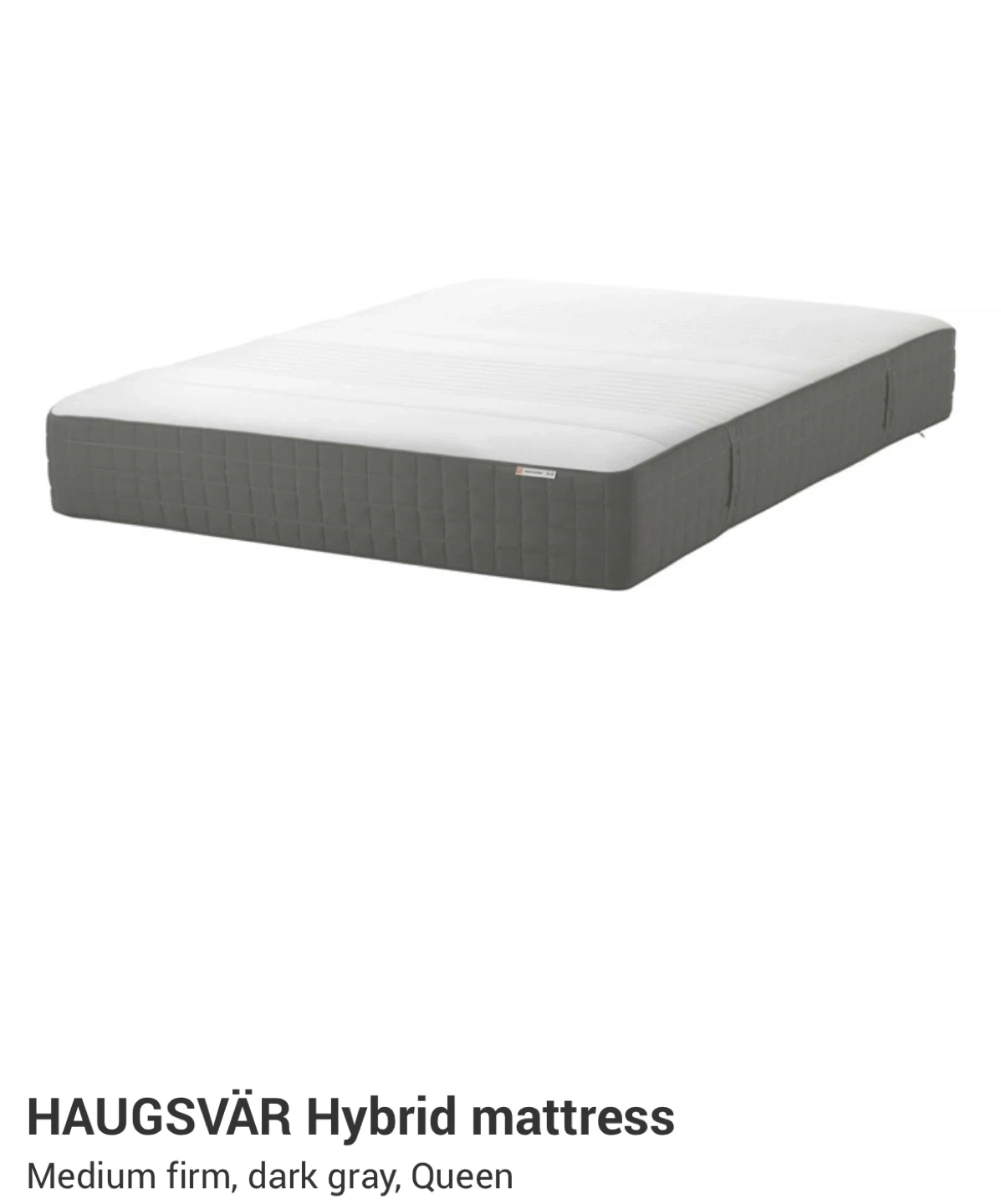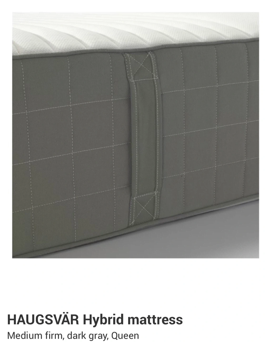 This is an IKEA HAUGSVAR Hybrid mattress. It's a Queen size in dark gray and medium firm. The mattress meets flammability standards.