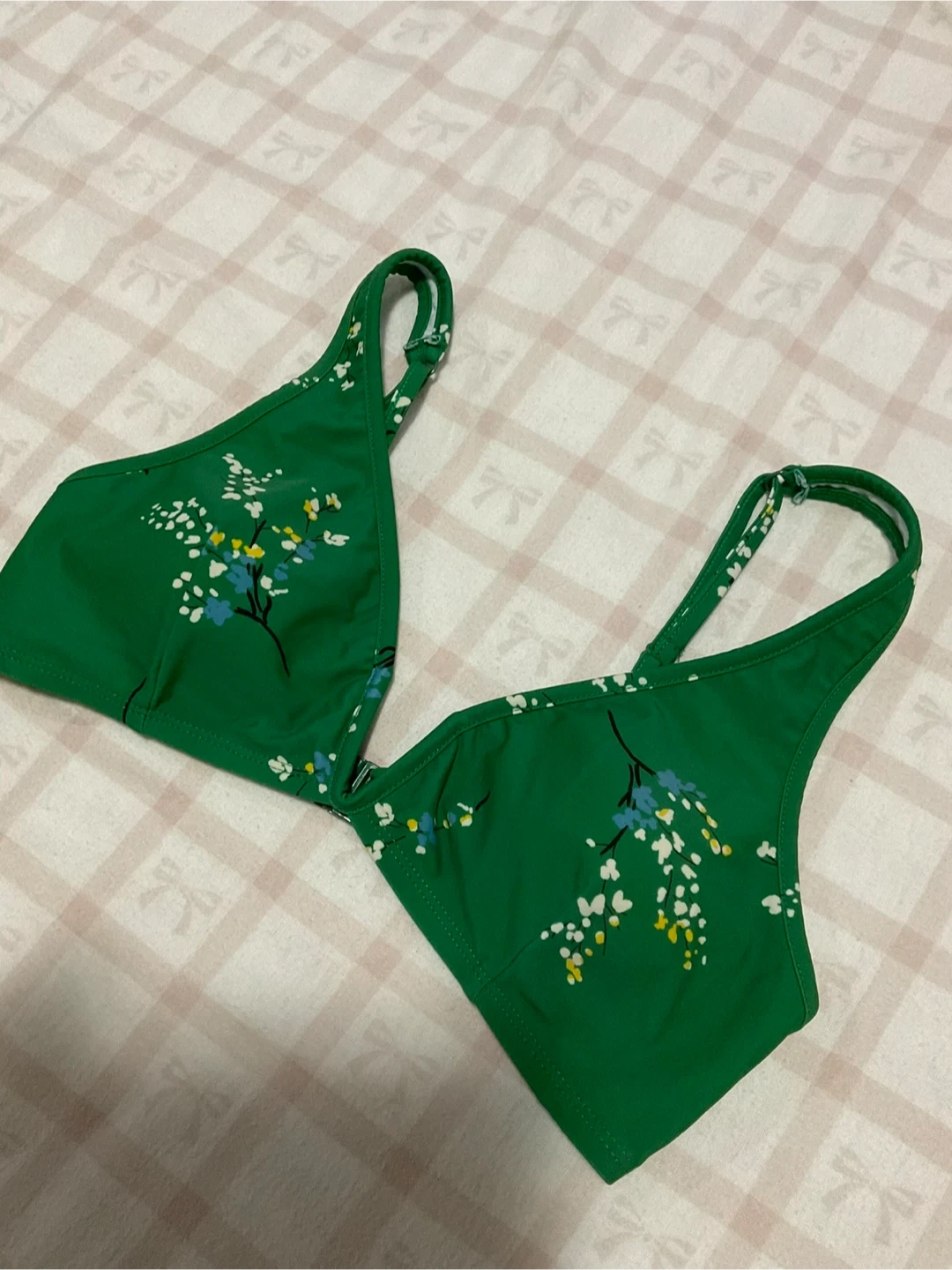 Green bikini top with a floral print. It has adjustable straps and a clasp closure.