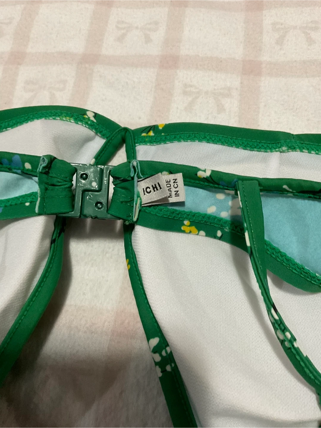 Green bikini top with a floral print. It has adjustable straps and a clasp closure.