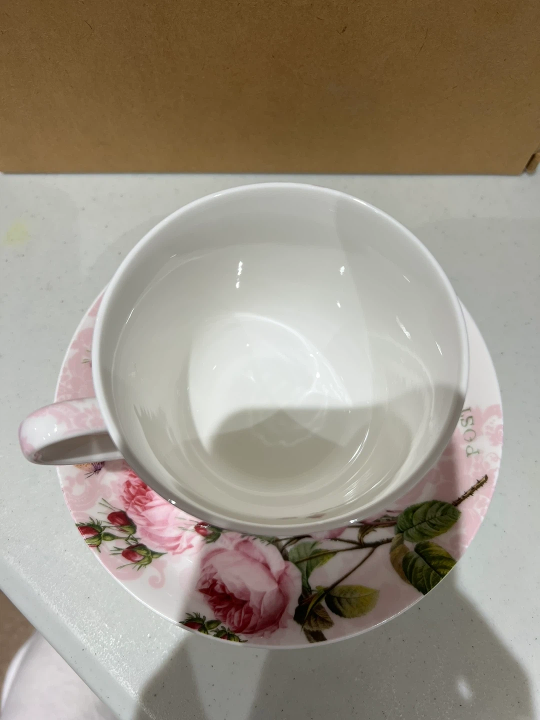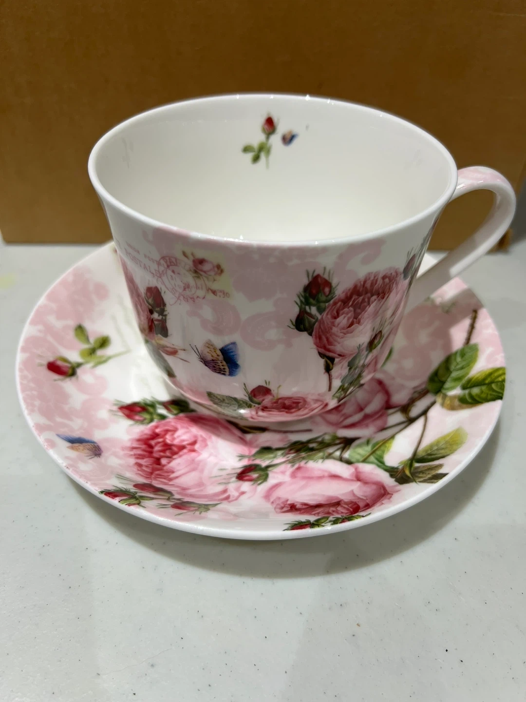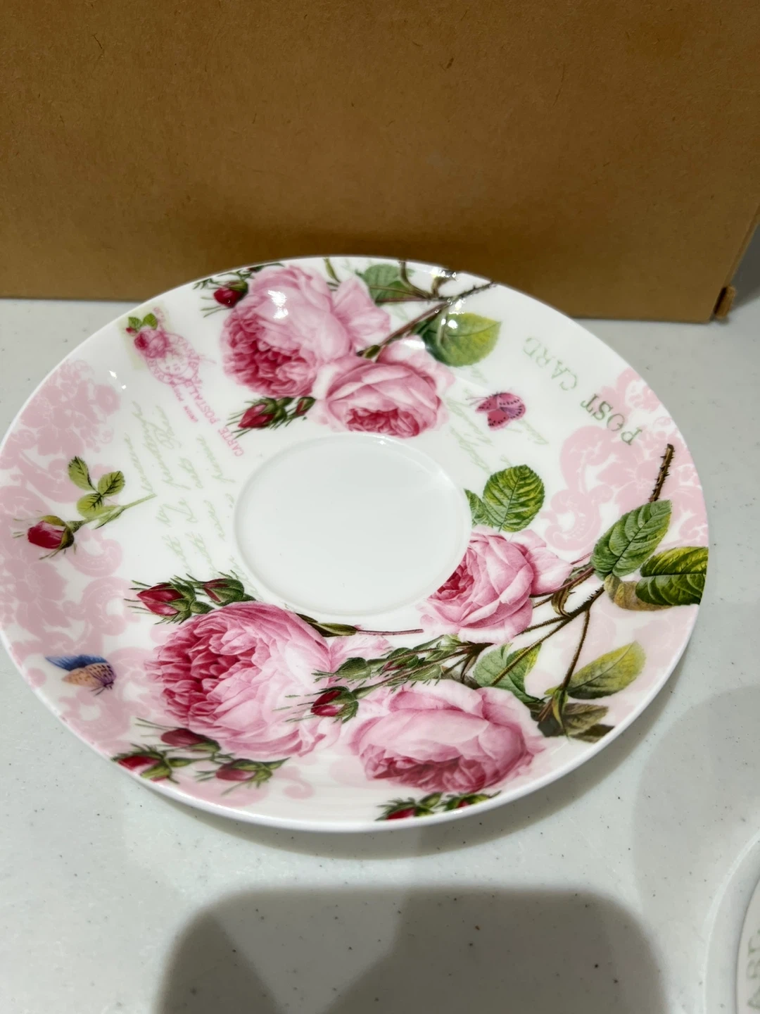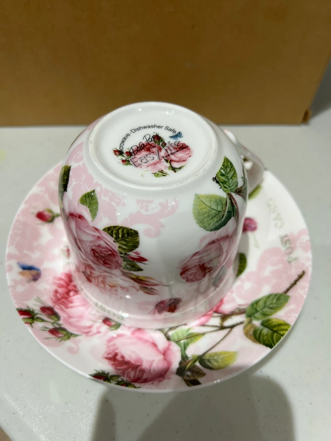 A lovely tea cup and saucer set featuring a delicate rose pattern and "Post Card" text. It's microwave and dishwasher safe for convenience. Made from fine bone china.