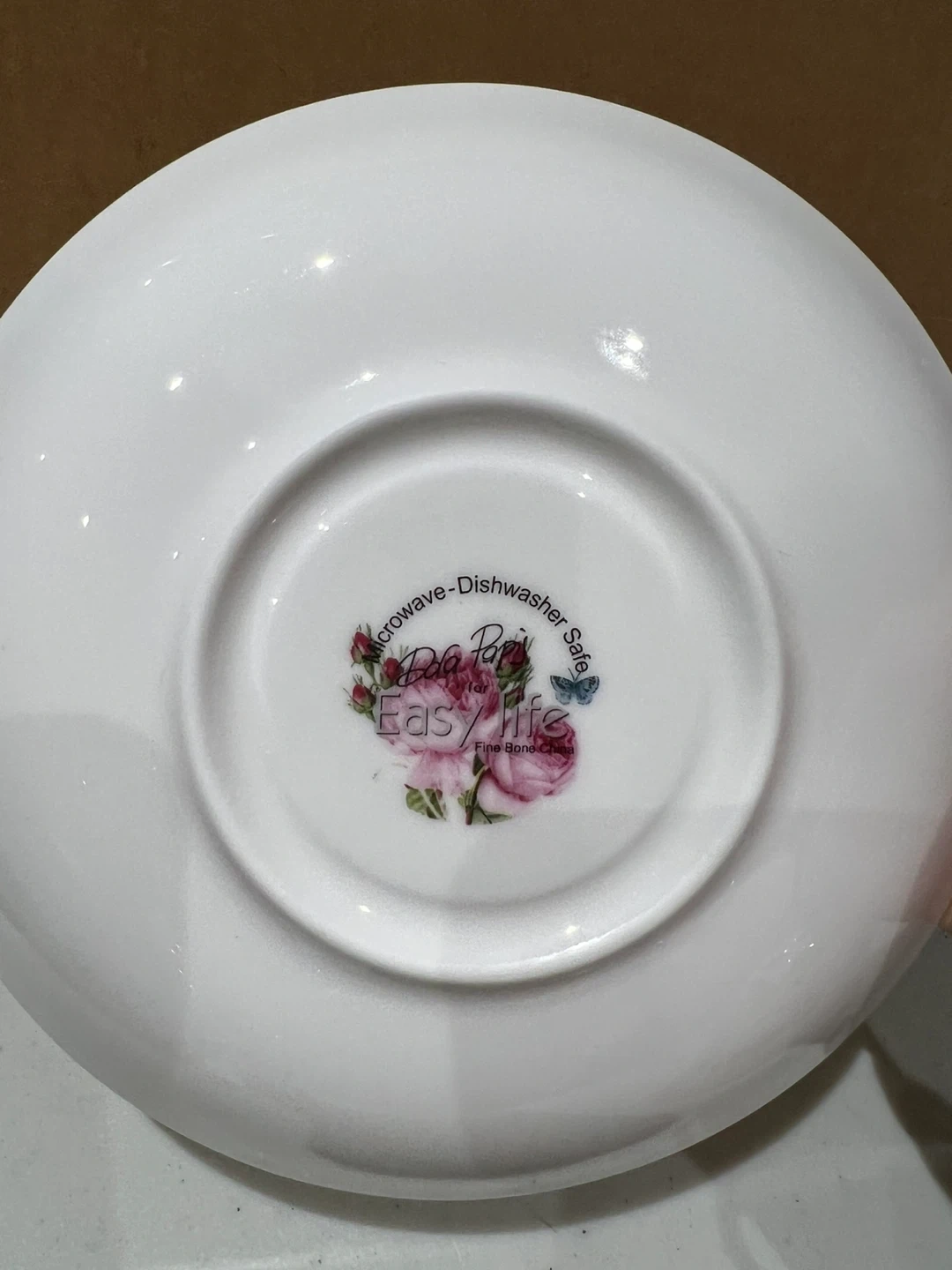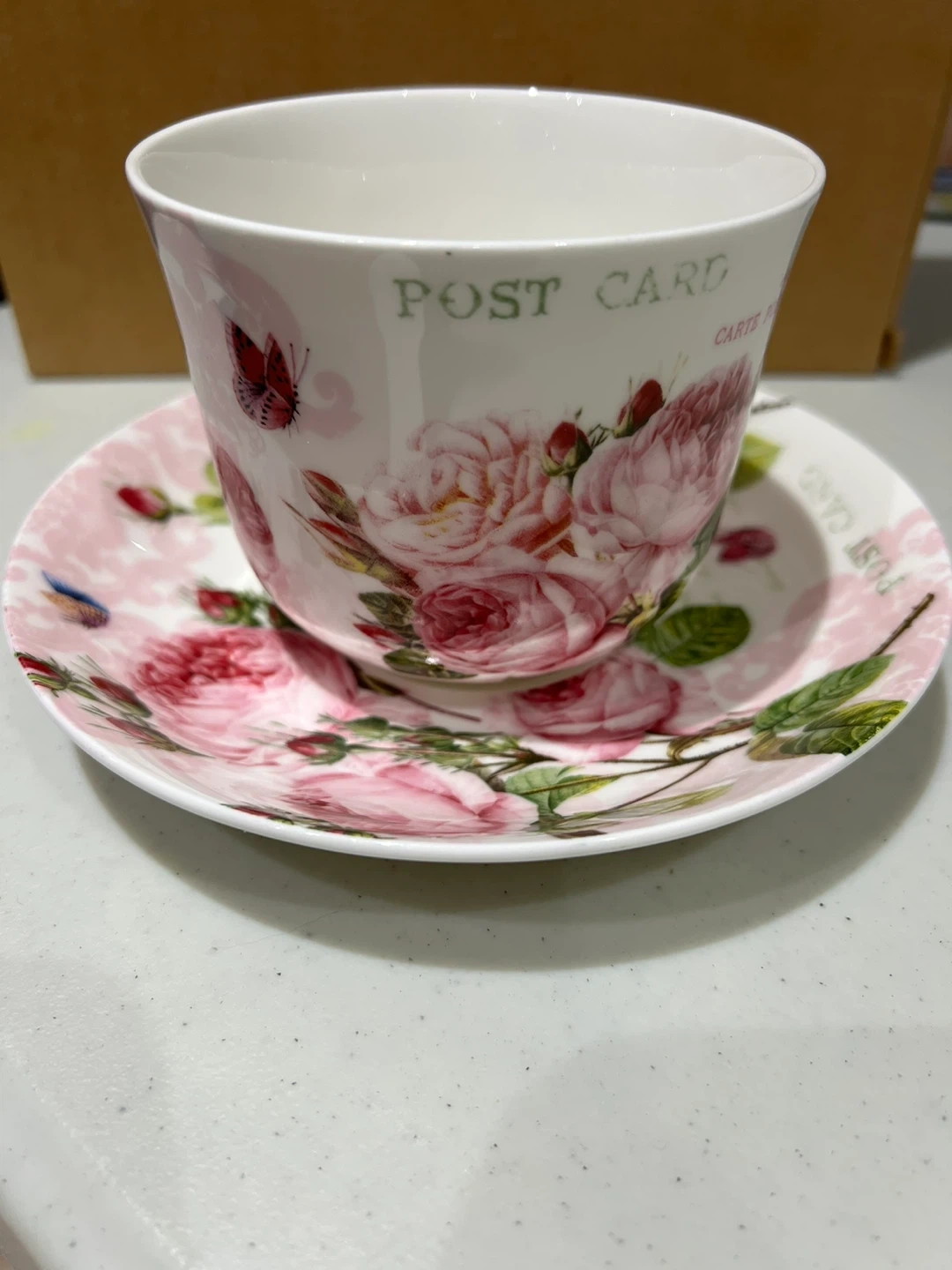 A lovely tea cup and saucer set featuring a delicate rose pattern and "Post Card" text. It's microwave and dishwasher safe for convenience. Made from fine bone china.