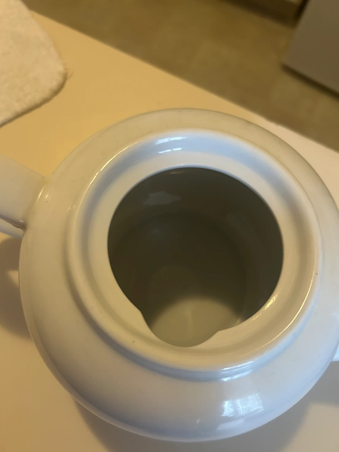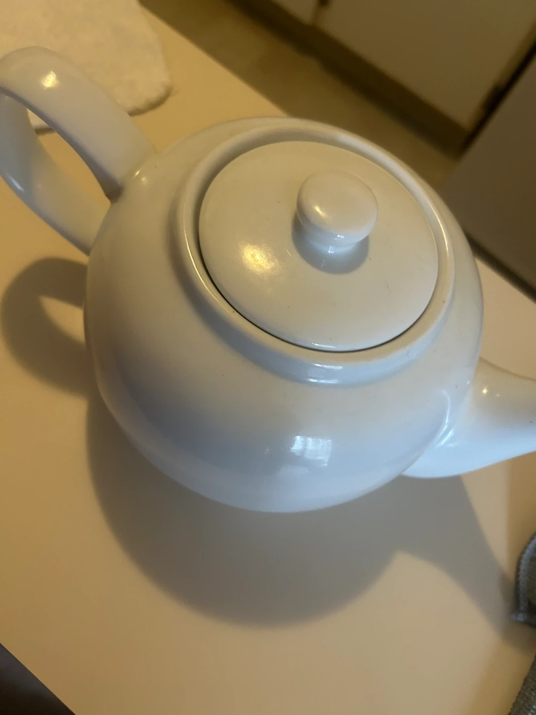 Here's a lovely white ceramic teapot! It's in great shape and would be perfect for brewing your favourite tea. It's a classic design that will fit right in with any kitchen decor