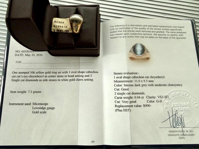 Unique 10k yellow gold ring featuring an oval cabochon cut cat's eye chrysoberyl centre stone (11.0 x 9.5 mm, intense dark grey with moderate chatoyancy) and two single-cut diamonds as side stones. The ring weighs 7.2 grams. Asking $450, replacement value $900 CAD. If you're reading this, it's still available.