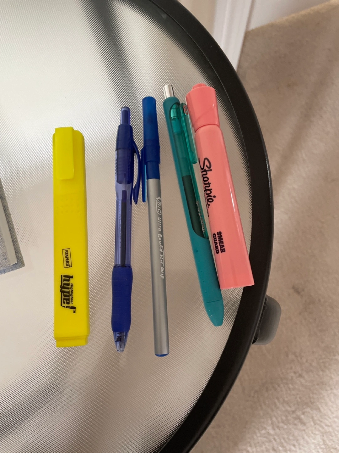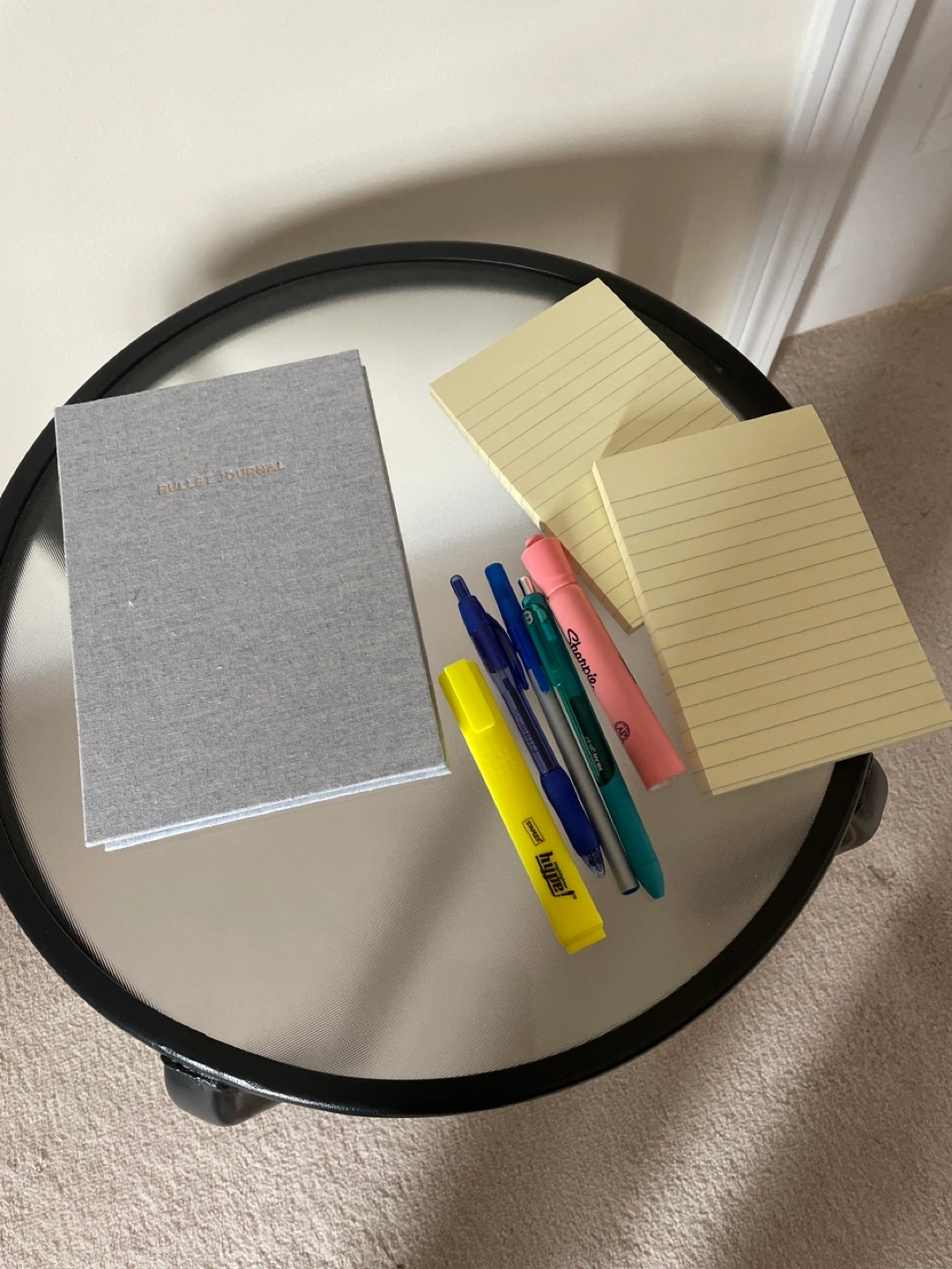 Grey bullet journal notebook. Includes various pens, including a BIC and Sharpie pen. Yellow highlighter. Pack of lined sticky notes. Perfect for students or anyone who loves to write.