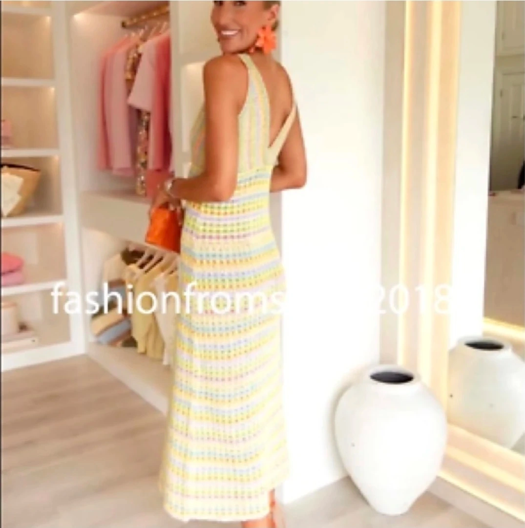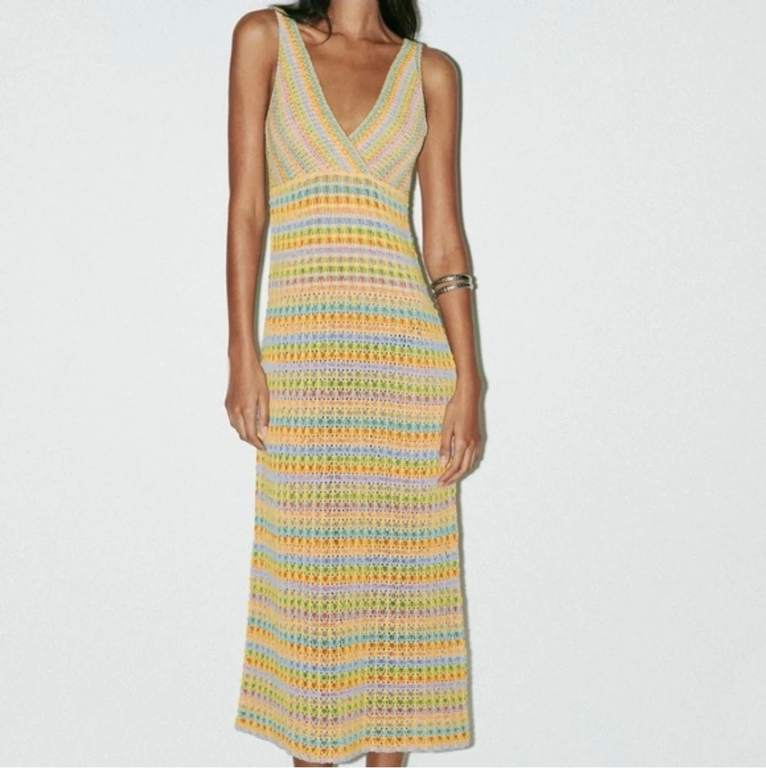 Elevate your summer wardrobe with this gorgeous, sold-out Zara crochet knit midi dress. Featuring a vibrant yet soft pastel multi-stripe pattern in shades of yellow, blue, pink, and orange, this piece is the ultimate vacation staple.