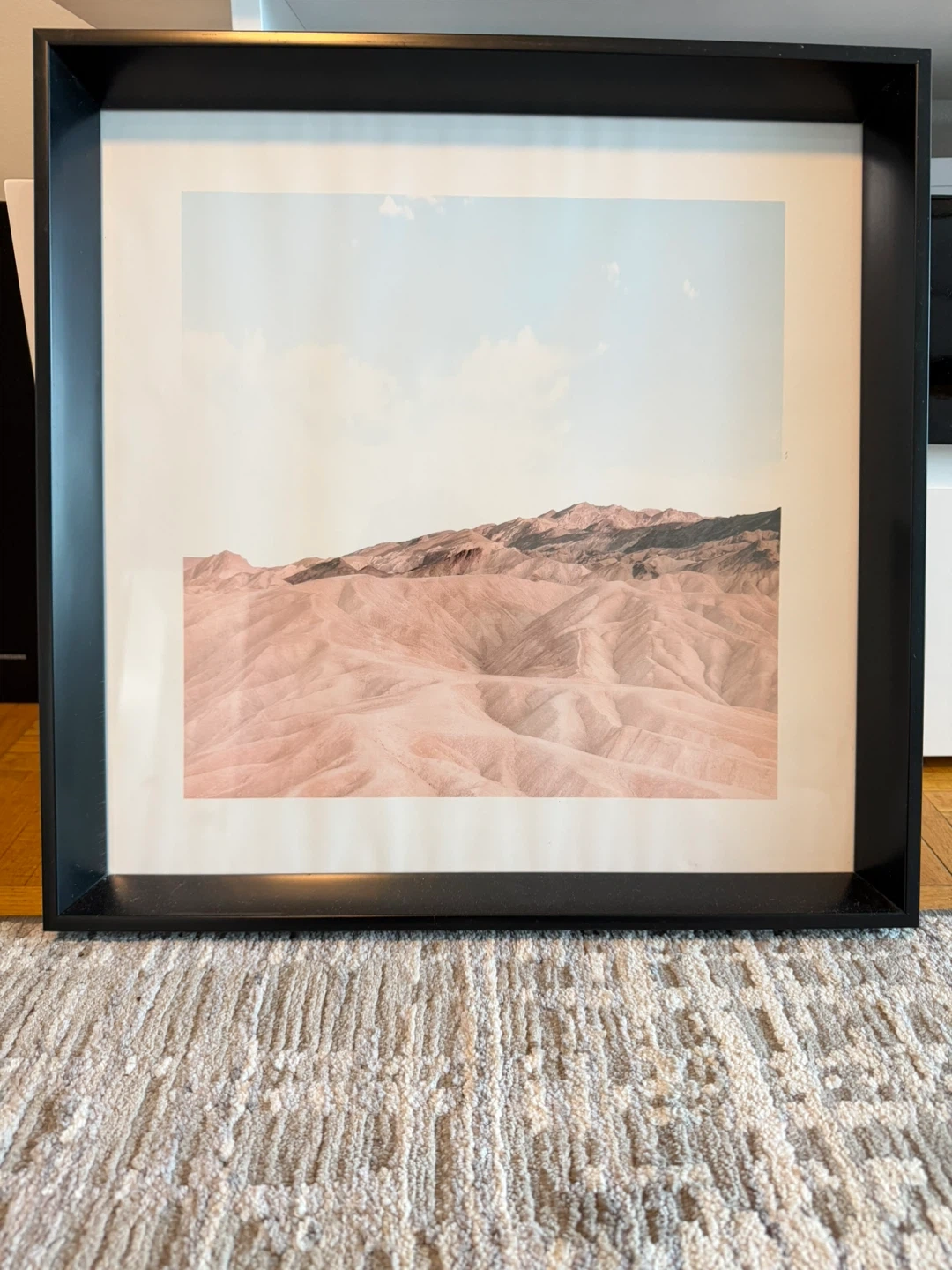 This is a framed print featuring a scenic desert landscape with rolling hills and a pale blue sky. It's housed in a simple black frame. This piece would add a touch of natural beauty to any room.