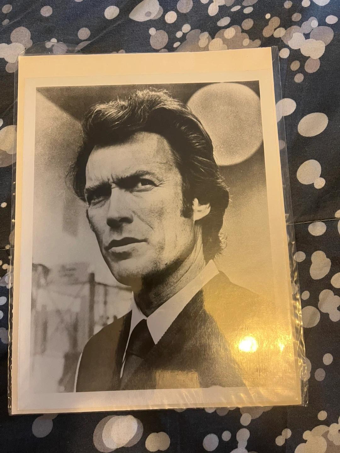 This is a black and white photograph featuring actor Clint Eastwood. The print appears to be on photo paper.