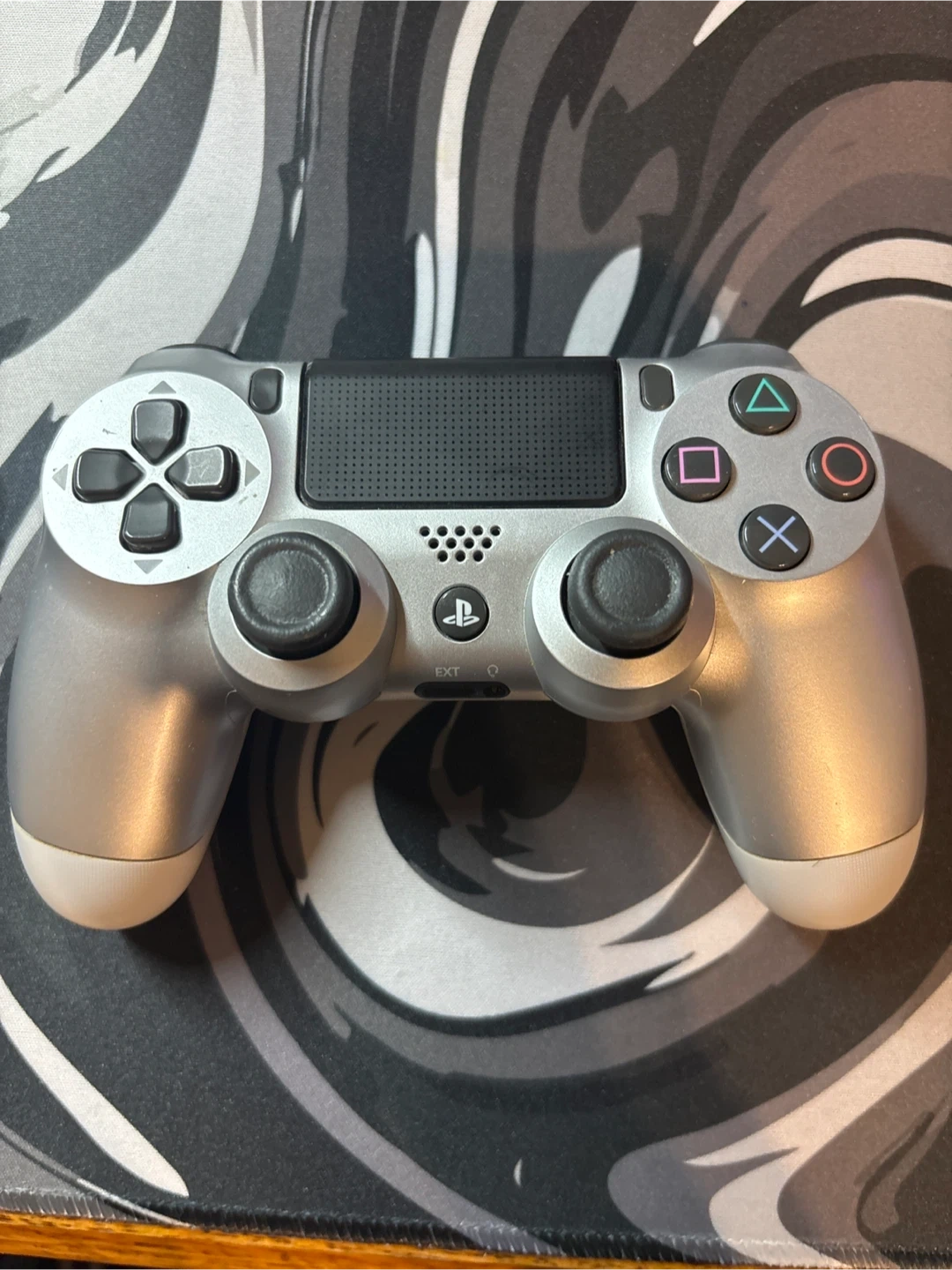 Silver DualShock 4 wireless controller for PlayStation 4. It's in great working condition. This controller is perfect for gaming sessions.