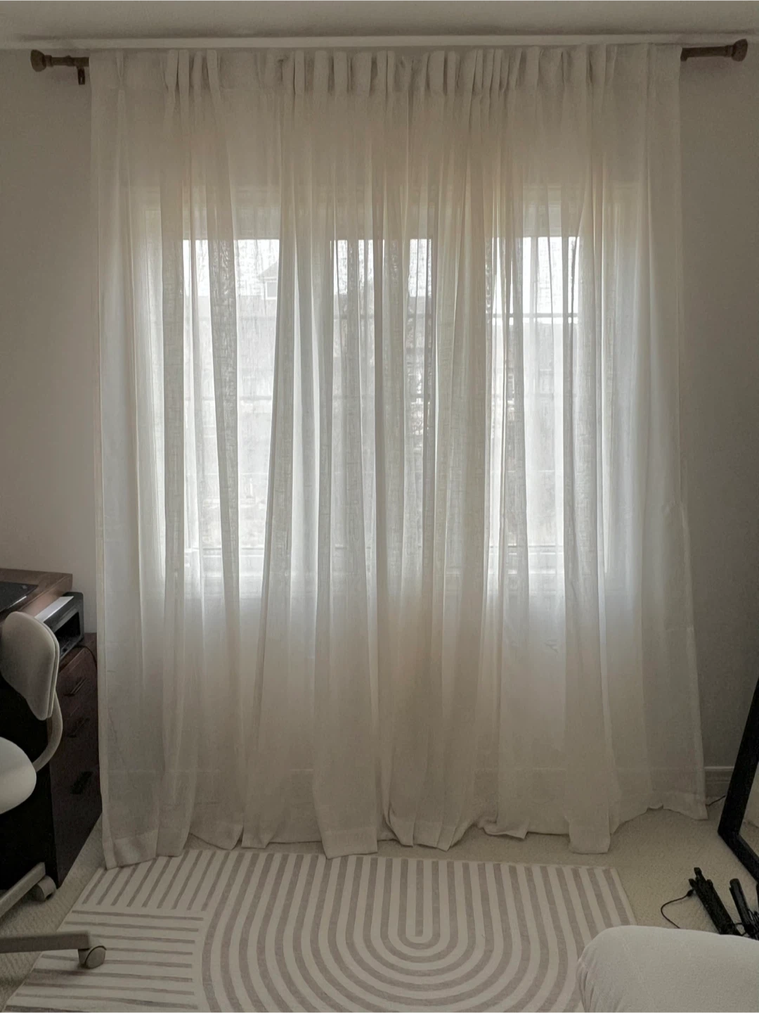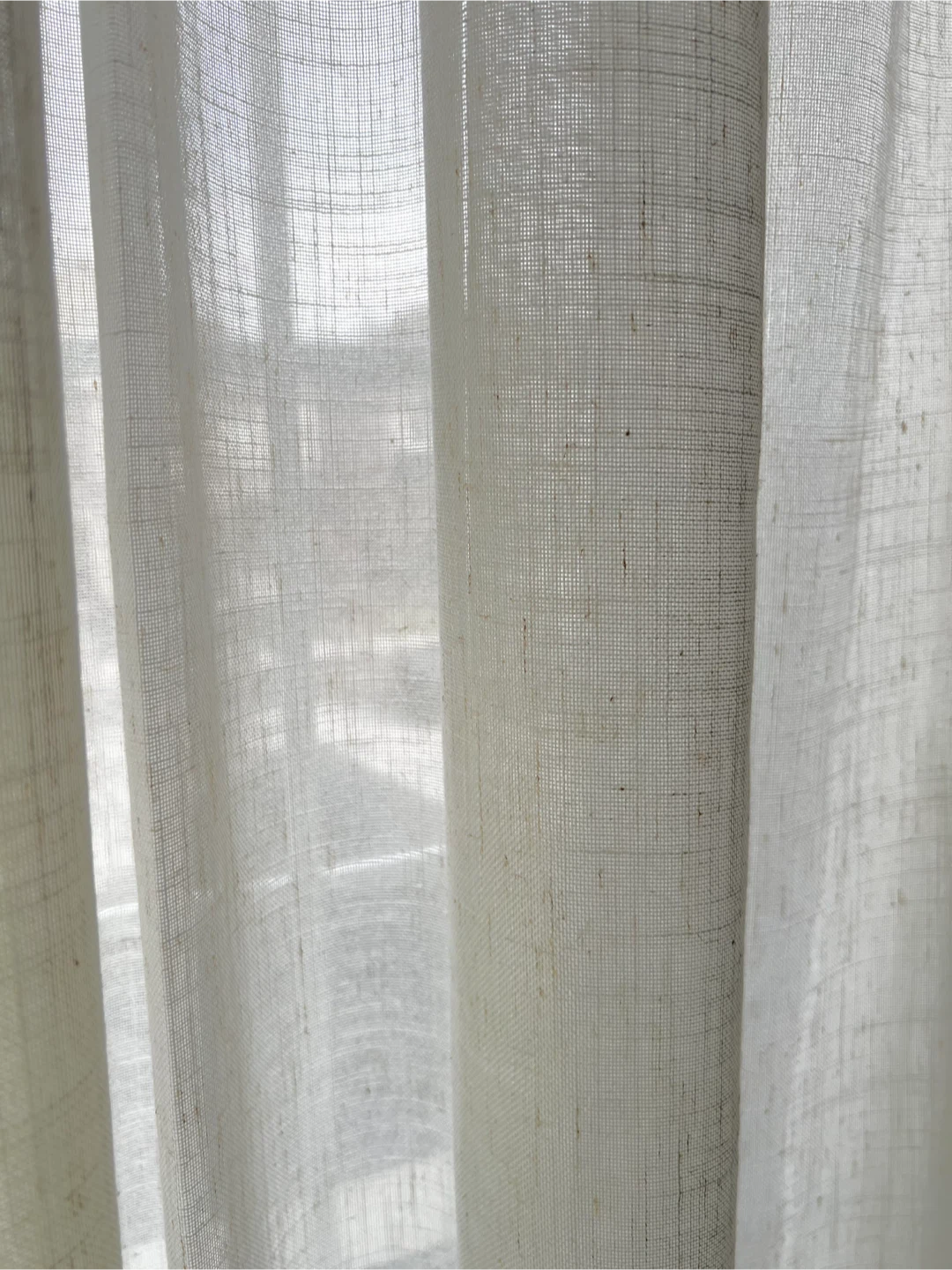 Set of sheer white curtains for 8ft tall ceilings. They're made of a linen-blend fabric.