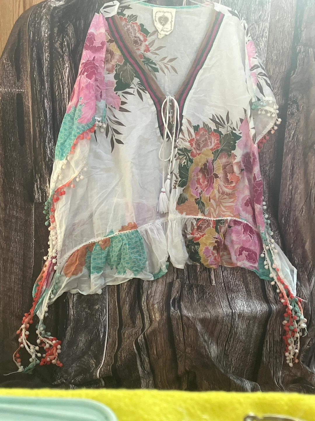 This is a women's floral print tunic cover-up. It features a V-neck with a drawstring and decorative tassels. Colorful pom-pom trim along the hem and sleeves adds a playful touch.