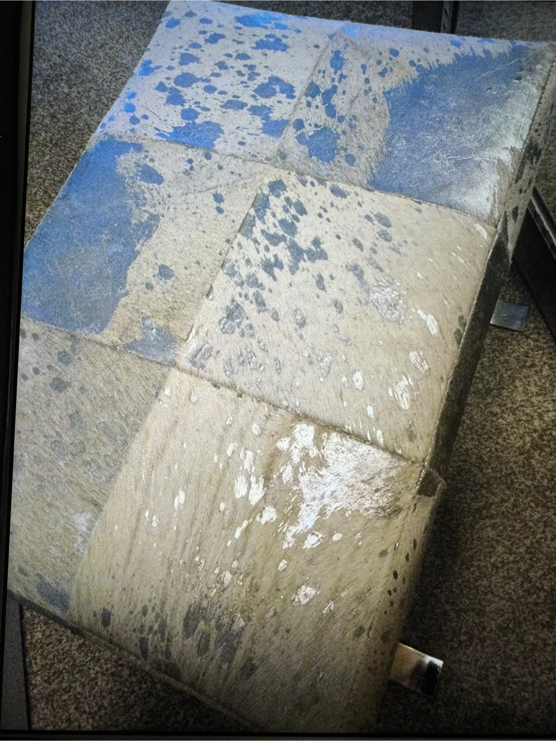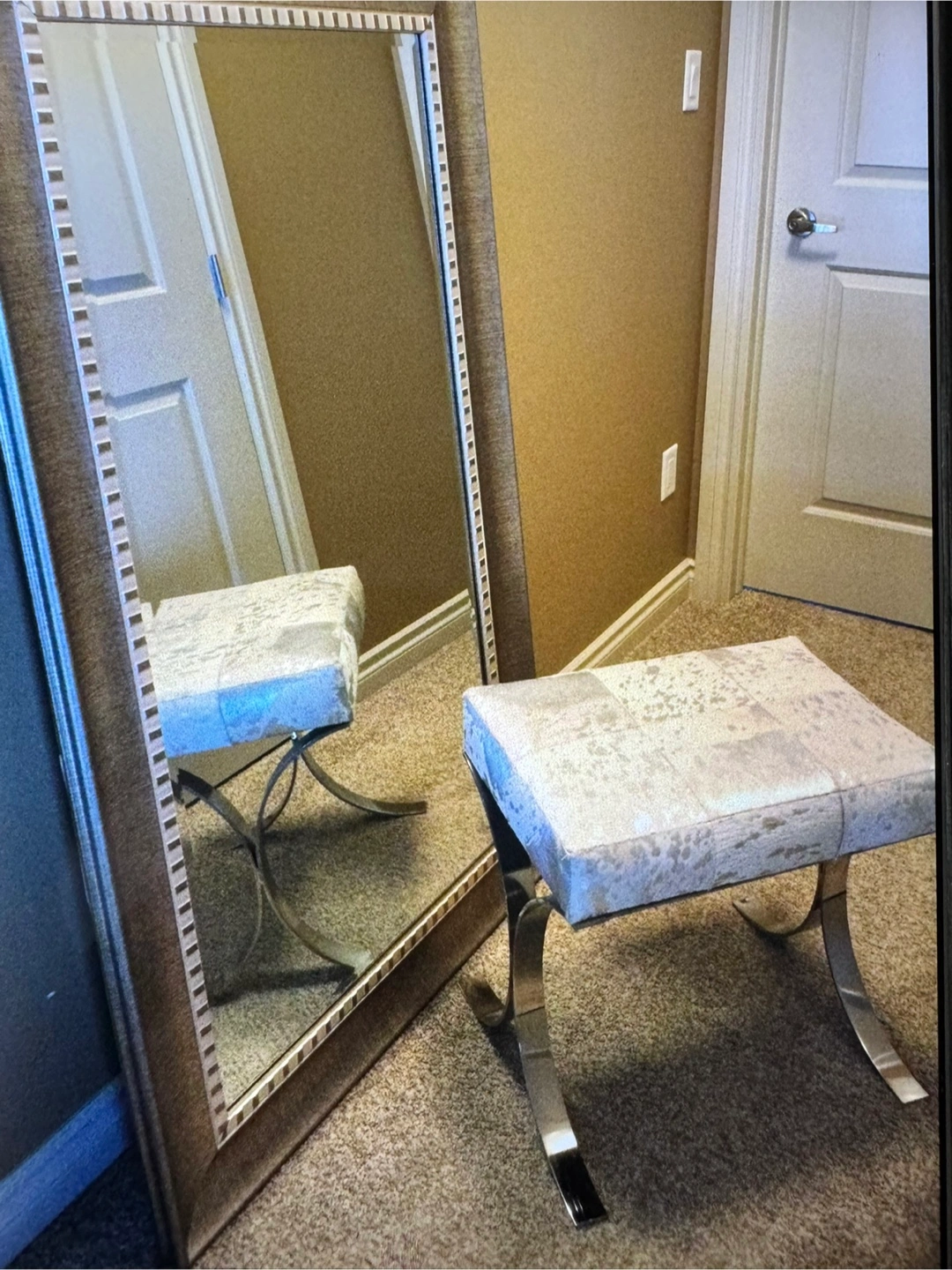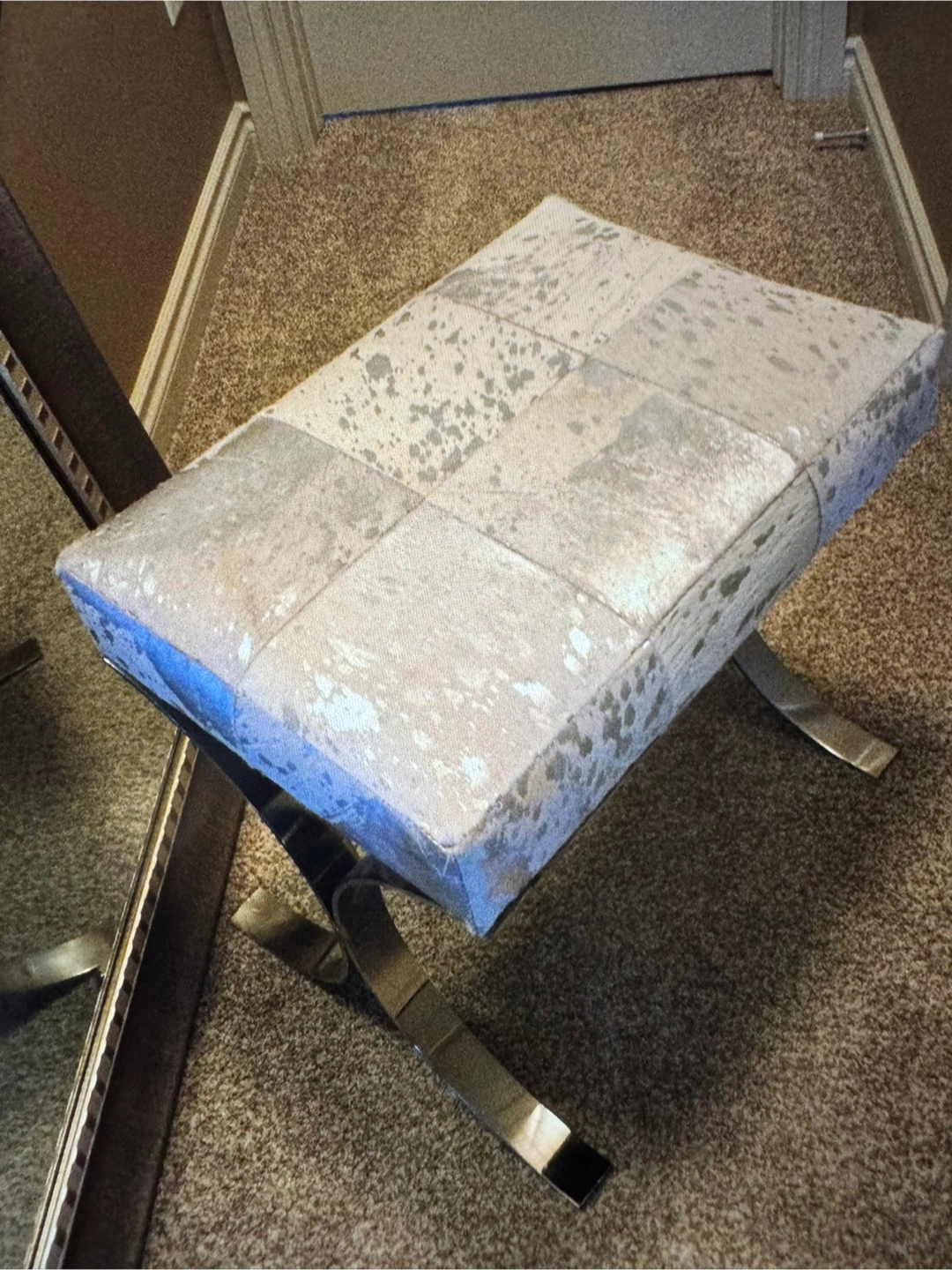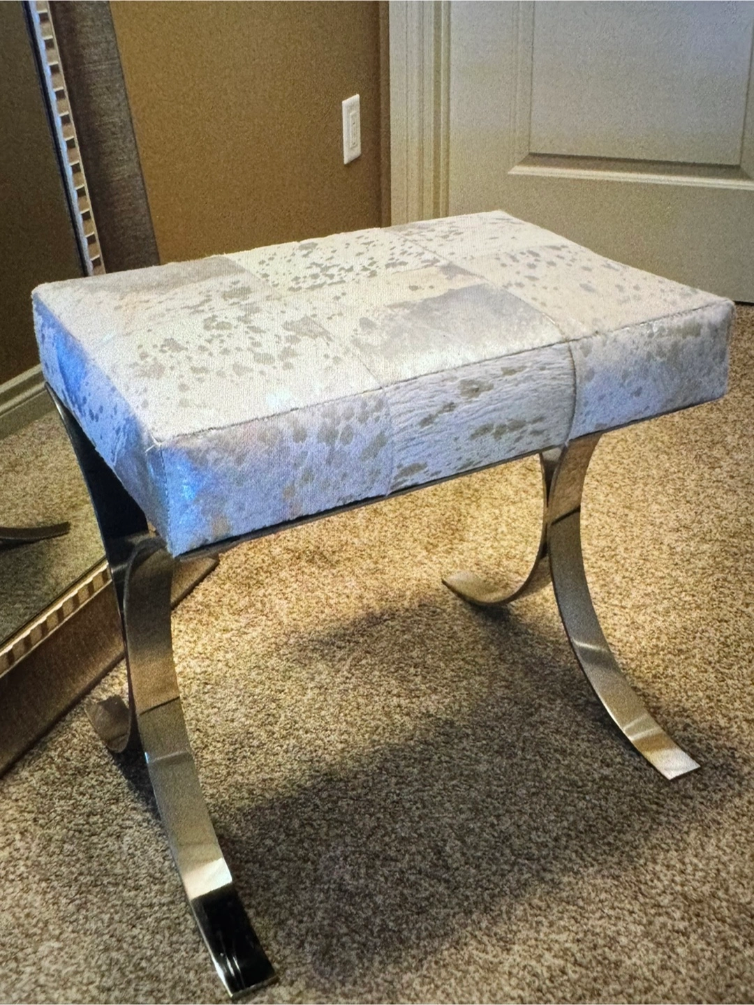 $75 Gorgeous cowhide metallic leopard print bench with a unique design. Features a patterned top, and a metal base.