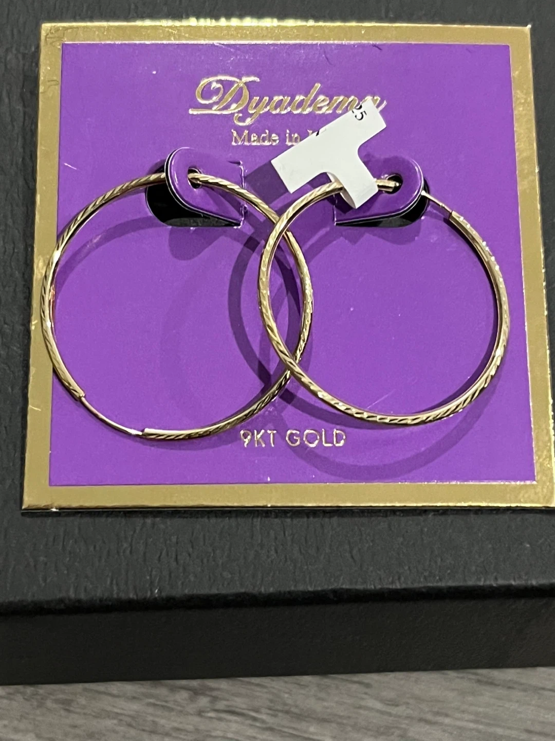 Brand new Dyadema hoop earrings made from 9KT gold. These stylish earrings feature a subtle textured design. They're perfect for adding a touch of elegance to any outfit!