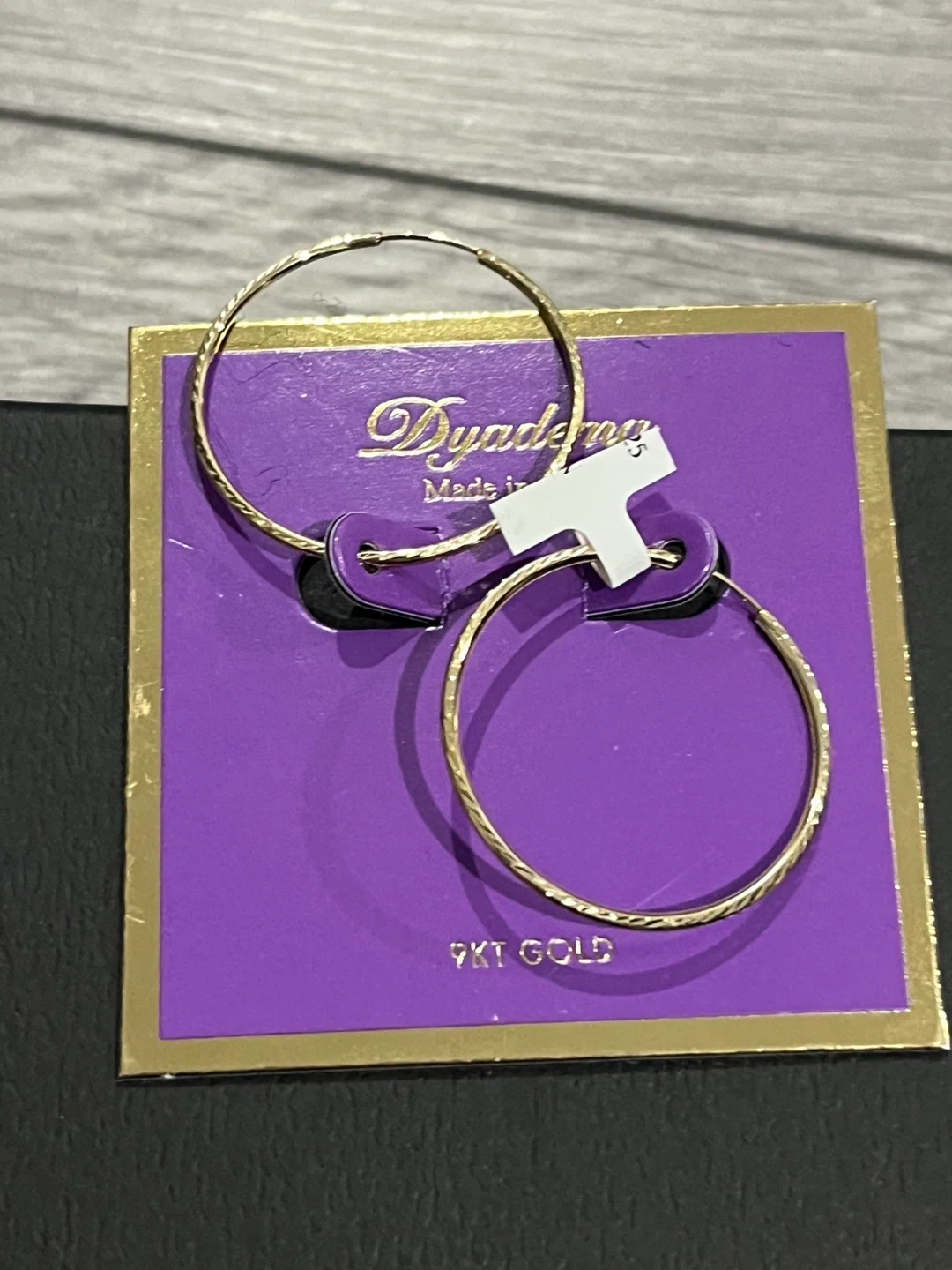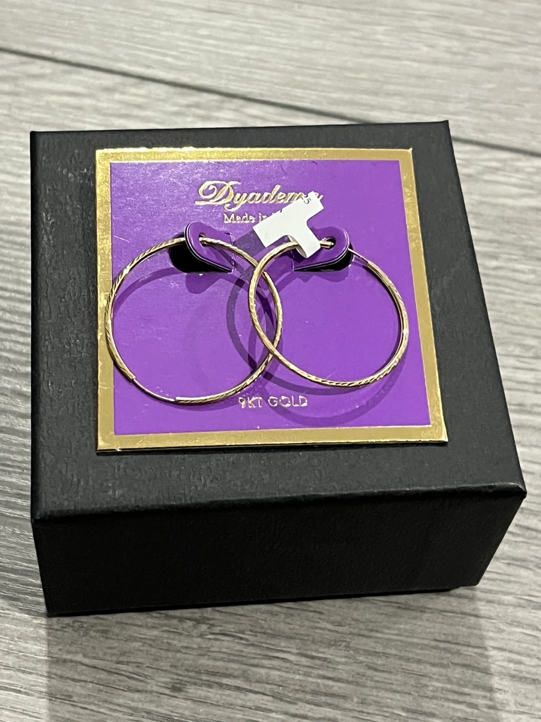 Brand new Dyadema hoop earrings made from 9KT gold. These stylish earrings feature a subtle textured design. They're perfect for adding a touch of elegance to any outfit!