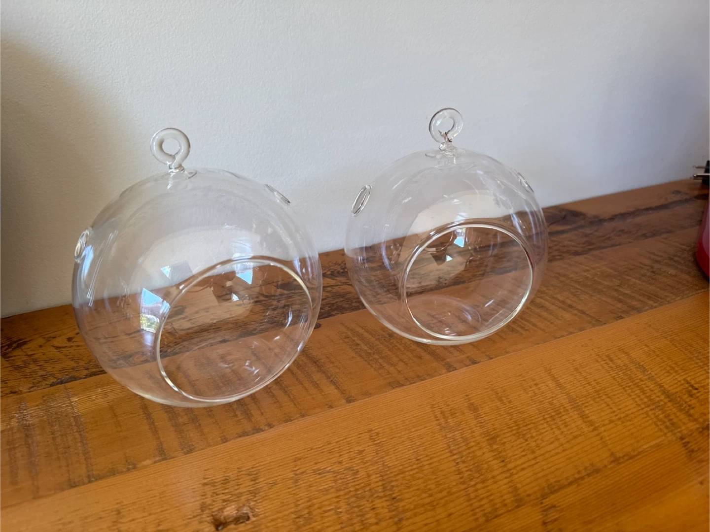 Selling a set of two clear glass hanging terrarium globes! These are perfect for adding a touch of greenery or creating a unique decorative display in your home. They're in great condition and ready to be filled with your favourite plants or ornaments