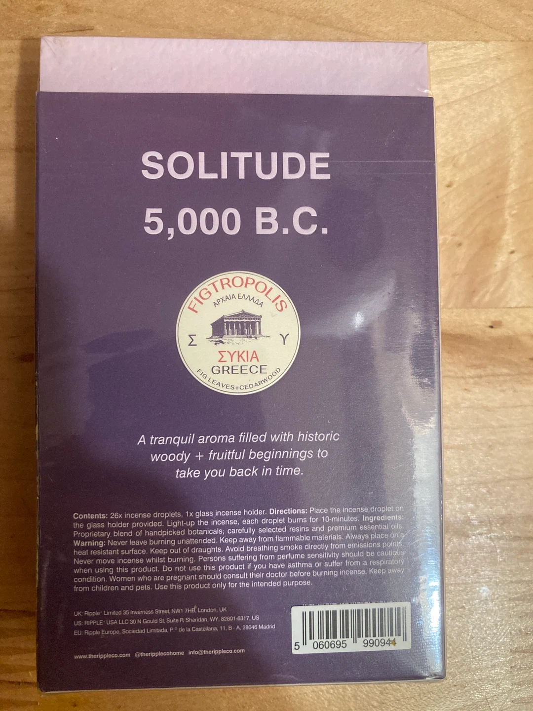 Ripple+ Home Fig Leaf, Oud & Amberwood incense droplets feature a tranquil aroma with woody, fruitful beginnings. It's formulated with Amberwood and Oud for a relaxing experience. This set includes 26 incense droplets and a glass holder. 1 glass holder. 26 droplets.
