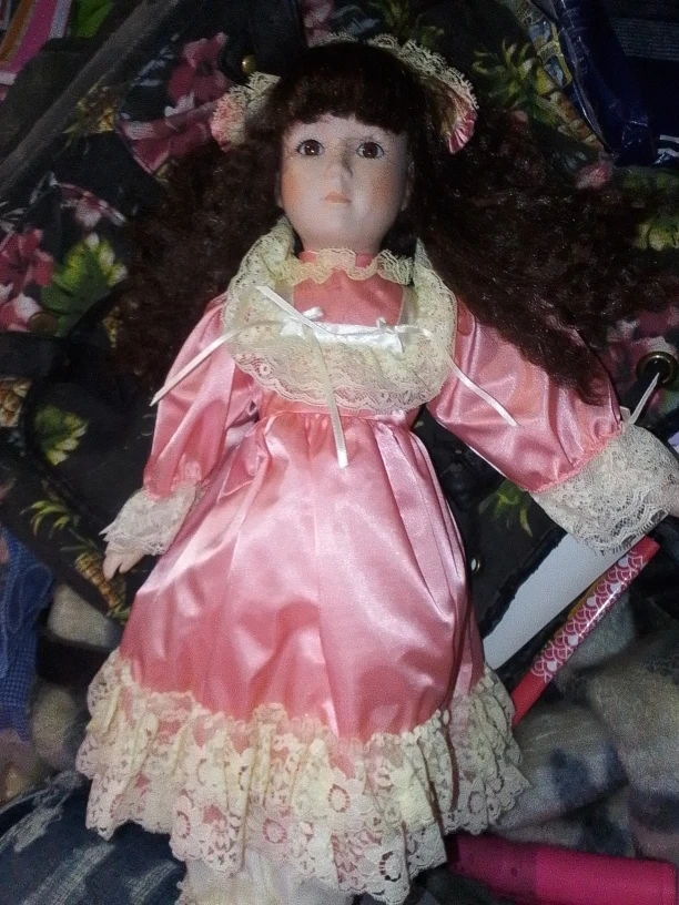 This is a lovely porcelain doll dressed in a pink and lace dress with matching hair ribbons. She has brown curly hair and sweet eyes. She would be a wonderful addition to any doll collection!